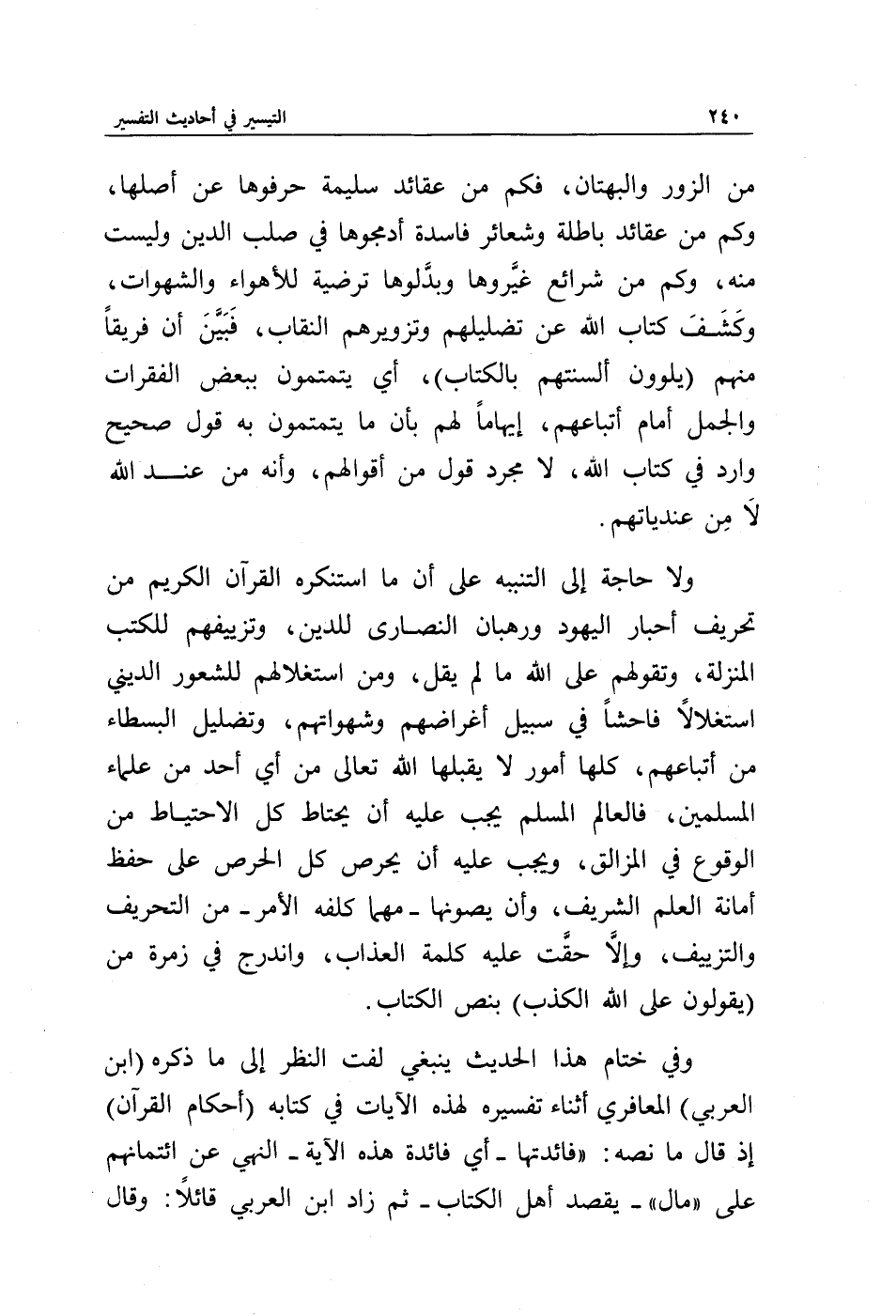 ولا حاجة على التنبيه على أن ما استنكره القرآن الكريم من تحريف أحبار اليهود ورهبان النصارى للدين وتزييفهم للكتب المنزلة، وتقولهم على الله ما لم يقل، ومن استغلالهم للشعور الديني استغلالا فاحشا في سبيل أغراضهم وشهواتهم، وتضليل البسطاء من أتباعهم، كلها أمور لا يقبلها الله تعالى من أي أحد من علماء المسلمين، فالعالم المسلم يجب عليه أن يحتاط كل الاحتياط من الوقوع في المزالق، ويجب عليه أن يحرص كل الحرص على حفظ أمانة العلم الشريف، وأن يصونها-مهما كلفه الأمر- من التحريف والتزييف، وإلا حقت عليه كلمة العذاب، واندرج في زمرة من {يَقُولُونَ عَلَى اللَّهِ الْكَذِبَ} بنص الكتاب.