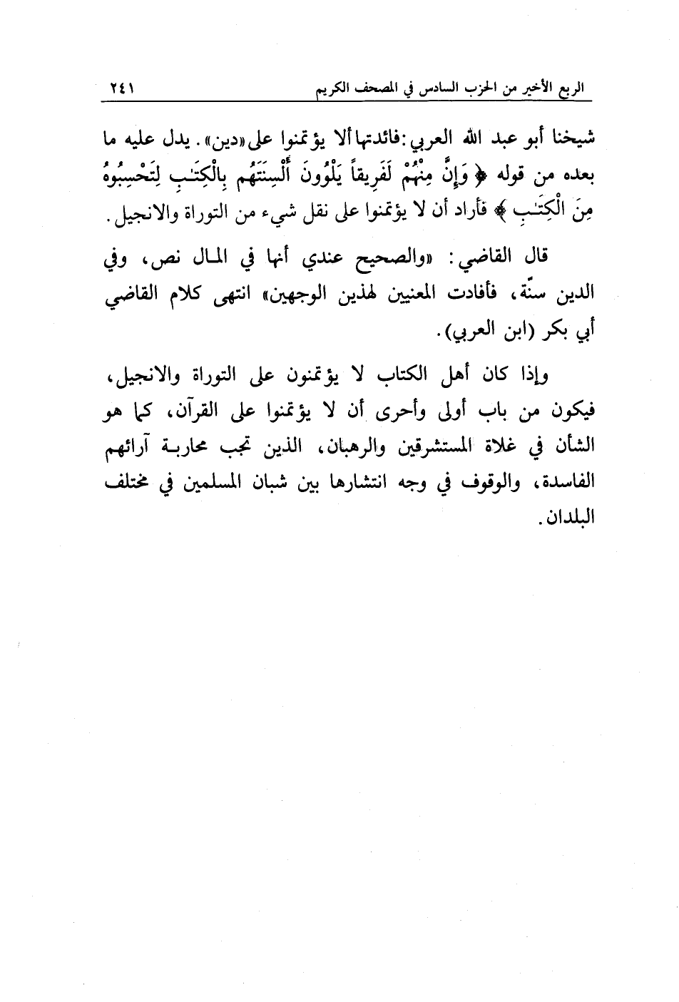 وإذا كان أهل الكتاب لا يؤتمنون على التوراة والإنجيل، فيكون من باب أولى وأحرى أن لا يؤتمنوا على القرآن، كما هو الشأن في غلاة المستشرقين والرهبان، الذين تجب محاربة أرائهم الفاسدة، والوقوف في وجه انتشارها بين شبان المسلمين في مختلف البلدان.