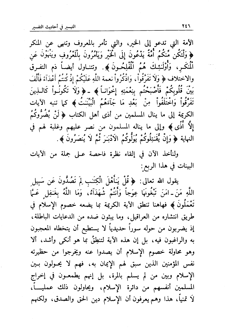 الأمة التي تدعو إلى الخير، والتي تأمر بالمعروف وتنهى عن المنكر {وَلْتَكُنْ مِنْكُمْ أُمَّةٌ يَدْعُونَ إِلَى الْخَيْرِ وَيَأْمُرُونَ بِالْمَعْرُوفِ وَيَنْهَوْنَ عَنِ الْمُنْكَرِ وَأُولَئِكَ هُمُ الْمُفْلِحُونَ}. وتتناول أيضا ذم التفرق والاختلاف {وَلَا تَفَرَّقُوا وَاذْكُرُوا نِعْمَتَ اللَّهِ عَلَيْكُمْ إِذْ كُنْتُمْ أَعْدَاءً فَأَلَّفَ بَيْنَ قُلُوبِكُمْ فَأَصْبَحْتُمْ بِنِعْمَتِهِ إِخْوَانًا} - {وَلَا تَكُونُوا كَالَّذِينَ تَفَرَّقُوا وَاخْتَلَفُوا مِنْ بَعْدِ مَا جَاءَهُمُ الْبَيِّنَاتُ}، كما تنبه الآيات الكريمة إلى ما ينال المسلمين من أذى أهل الكتاب {لَنْ يَضُرُّوكُمْ إِلَّا أَذًى} وإلى ما يناله المسلمون من نصر عليهم وغلبة لهم في النهاية {وَإِنْ يُقَاتِلُوكُمْ يُوَلُّوكُمُ الْأَدْبَارَ ثُمَّ لَا يُنْصَرُونَ}.