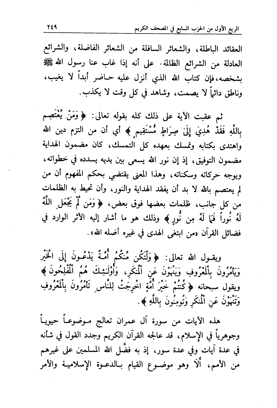 ثم عقبت الآية على ذلك كله بقوله تعالى: {وَمَنْ يَعْتَصِمْ بِاللَّهِ فَقَدْ هُدِيَ إِلَى صِرَاطٍ مُسْتَقِيمٍ} أي أن من التزم دين الله واهتدى بكتابه وتمسك بعهده كل التمسك، كان مضمون الهداية مضمون التوفيق، إذ إن نور الله يسعى بين يديه يسدده في خطواته، ويوجه حركاته وسكناته، وهذا المعنى يقتضي بحكم المفهوم أن من لم يعتصم بالله لا بد أن يفقد الهداية والنور، وأن تحيط به الظلمات من كل جانب، ظلمات بعضها فوق بعض، {وَمَنْ لَمْ يَجْعَلِ اللَّهُ لَهُ نُورًا فَمَا لَهُ مِنْ نُورٍ} وذلك هو ما أشار إليه الأثر الوارد في فضائل القرآن (من ابتغى الهدى في غيره أضله الله).