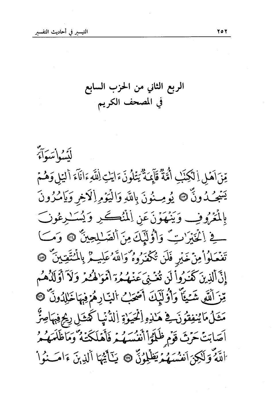 لَيْسُوا سَوَاءً مِنْ أَهْلِ الْكِتَابِ أُمَّةٌ قَائِمَةٌ يَتْلُونَ آيَاتِ اللَّهِ آنَاءَ اللَّيْلِ وَهُمْ يَسْجُدُونَ (113) يُؤْمِنُونَ بِاللَّهِ وَالْيَوْمِ الْآخِرِ وَيَأْمُرُونَ بِالْمَعْرُوفِ وَيَنْهَوْنَ عَنِ الْمُنْكَرِ وَيُسَارِعُونَ فِي الْخَيْرَاتِ وَأُولَئِكَ مِنَ الصَّالِحِينَ (114) وَمَا يَفْعَلُوا مِنْ خَيْرٍ فَلَنْ يُكْفَرُوهُ وَاللَّهُ عَلِيمٌ بِالْمُتَّقِينَ (115) إِنَّ الَّذِينَ كَفَرُوا لَنْ تُغْنِيَ عَنْهُمْ أَمْوَالُهُمْ وَلَا أَوْلَادُهُمْ مِنَ اللَّهِ شَيْئًا وَأُولَئِكَ أَصْحَابُ النَّارِ هُمْ فِيهَا خَالِدُونَ (116) مَثَلُ مَا يُنْفِقُونَ فِي هَذِهِ الْحَيَاةِ الدُّنْيَا كَمَثَلِ رِيحٍ فِيهَا صِرٌّ أَصَابَتْ حَرْثَ قَوْمٍ ظَلَمُوا أَنْفُسَهُمْ فَأَهْلَكَتْهُ وَمَا ظَلَمَهُمُ اللَّهُ وَلَكِنْ أَنْفُسَهُمْ يَظْلِمُونَ (117) يَا أَيُّهَا الَّذِينَ آمَنُوا