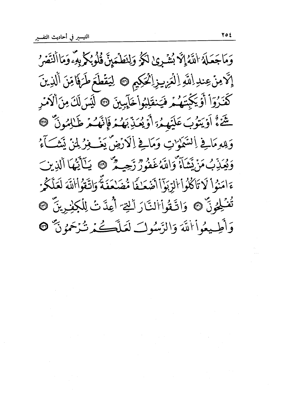 وَمَا جَعَلَهُ اللَّهُ إِلَّا بُشْرَى لَكُمْ وَلِتَطْمَئِنَّ قُلُوبُكُمْ بِهِ وَمَا النَّصْرُ إِلَّا مِنْ عِنْدِ اللَّهِ الْعَزِيزِ الْحَكِيمِ (126) لِيَقْطَعَ طَرَفًا مِنَ الَّذِينَ كَفَرُوا أَوْ يَكْبِتَهُمْ فَيَنْقَلِبُوا خَائِبِينَ (127) لَيْسَ لَكَ مِنَ الْأَمْرِ شَيْءٌ أَوْ يَتُوبَ عَلَيْهِمْ أَوْ يُعَذِّبَهُمْ فَإِنَّهُمْ ظَالِمُونَ (128) وَلِلَّهِ مَا فِي السَّمَاوَاتِ وَمَا فِي الْأَرْضِ يَغْفِرُ لِمَنْ يَشَاءُ وَيُعَذِّبُ مَنْ يَشَاءُ وَاللَّهُ غَفُورٌ رَحِيمٌ (129) يَا أَيُّهَا الَّذِينَ آمَنُوا لَا تَأْكُلُوا الرِّبَا أَضْعَافًا مُضَاعَفَةً وَاتَّقُوا اللَّهَ لَعَلَّكُمْ تُفْلِحُونَ (130) وَاتَّقُوا النَّارَ الَّتِي أُعِدَّتْ لِلْكَافِرِينَ (131) وَأَطِيعُوا اللَّهَ وَالرَّسُولَ لَعَلَّكُمْ تُرْحَمُونَ (132)