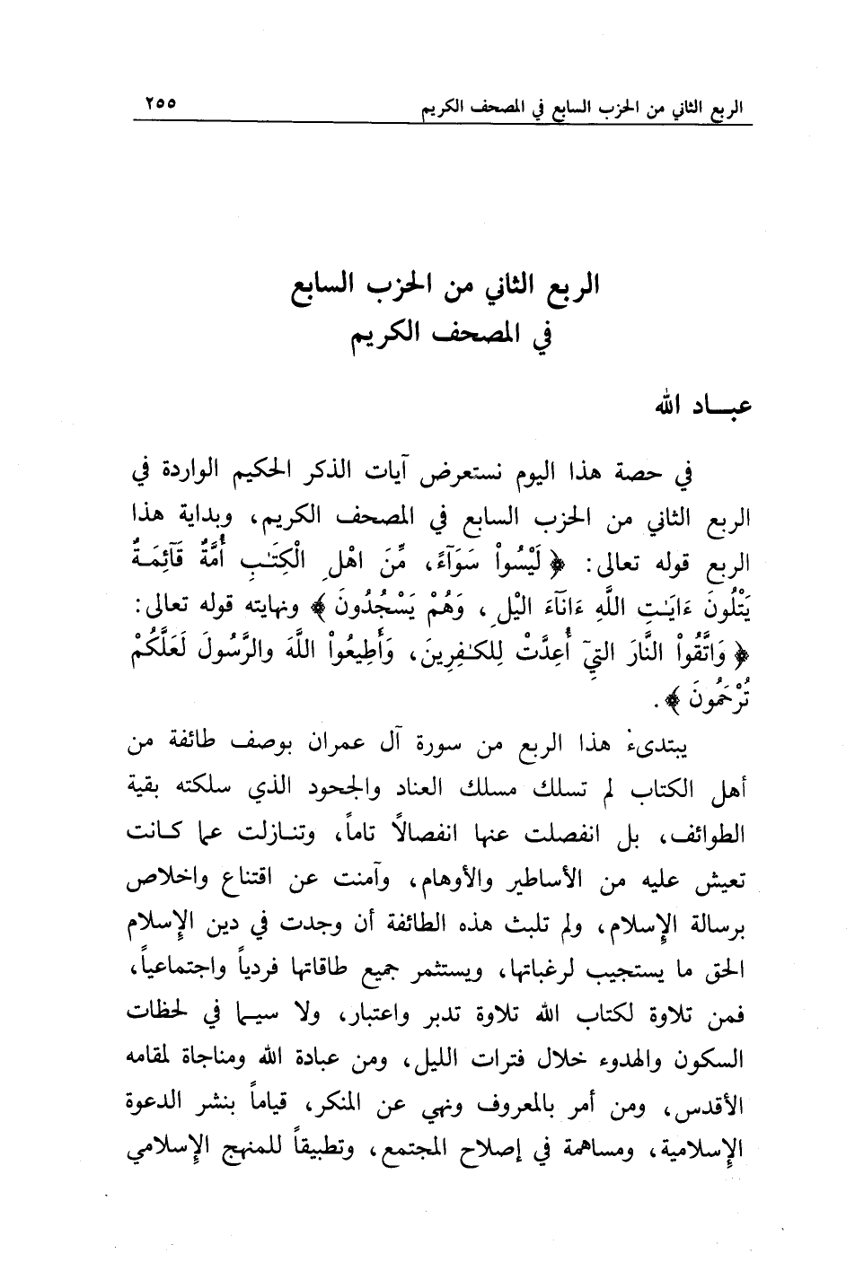 يبتدئ هذا الربع من سورة آل عمران بوصف طائفة من أهل الكتاب لم تسلك مسلك العناد والجحود الذي سلكته بقية الطوائف، بل انفصلت عنها انفصالا تاما، وتنازلت عما كانت تعيش عليه من الأساطير والأوهام، وآمنت عن اقتناع وإخلاص برسالة الإسلام، ولم تلبث هذه الطائفة أن وجدت في دين الإسلام الحق ما يستجيب لرغباتها، ويستثمر جميع طاقاتها فرديا واجتماعيا، فمن تلاوة لكتاب الله تلاوة تدبر واعتبار، ولا سيما في لحظات السكون والهدوء خلال فترات الليل، ومن عبادة الله ومناجاة مقامه الأقدس، ومن أمر بالمعروف ونهي عن المنكر، قياما بنشر الدعوة الإسلامية، ومساهمة في إصلاح المجتمع، وتطبيقا للمنهج الإسلامي