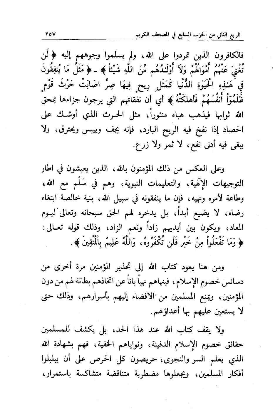 فالكافرون الذين تمردوا على الله، ولم يسلموا وجوههم إليه {لَنْ تُغْنِيَ عَنْهُمْ أَمْوَالُهُمْ وَلَا أَوْلَادُهُمْ مِنَ اللَّهِ شَيْئًا} - {مَثَلُ مَا يُنْفِقُونَ فِي هَذِهِ الْحَيَاةِ الدُّنْيَا كَمَثَلِ رِيحٍ فِيهَا صِرٌّ أَصَابَتْ حَرْثَ قَوْمٍ ظَلَمُوا أَنْفُسَهُمْ فَأَهْلَكَتْهُ} أي أن نفقاتهم التي يرجون جزاءها يمحق الله ثوابها فيذهب هباء منثورا، مثل الحرث الذي أوشك على الحصاد إذا نفخ فيه الريح البارد، فإنه يجف وييبس ويحترق، ولا يبقى فيه أدنى نفع، لا ثمر ولا زرع.