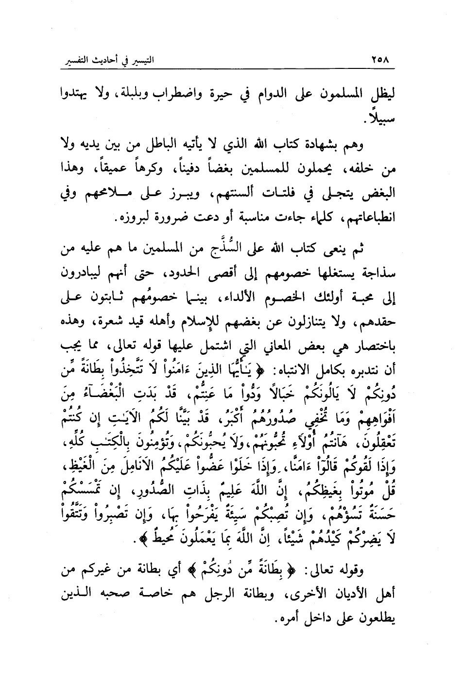 ثم ينعى كتاب الله على السذج من المسلمين ما هم عليه من سذاجة يستغلها خصومهم إلى أقصى الحدود، حتى أنهم ليبادرون إلى محبة أولئك الخصوم الألداء، بينما خصومهم ثابتون على حقهم، ولا يتنازلون عن بغضهم للإسلام وأهله قيد شعرة، وهذه باختصار هي بعض المعاني التي اشتمل عليها قوله تعالى، مما يجب أن نتدبره بكامل الانتباه: {يَا أَيُّهَا الَّذِينَ آمَنُوا لَا تَتَّخِذُوا بِطَانَةً مِنْ دُونِكُمْ لَا يَأْلُونَكُمْ خَبَالًا وَدُّوا مَا عَنِتُّمْ قَدْ بَدَتِ الْبَغْضَاءُ مِنْ أَفْوَاهِهِمْ وَمَا تُخْفِي صُدُورُهُمْ أَكْبَرُ قَدْ بَيَّنَّا لَكُمُ الْآيَاتِ إِنْ كُنْتُمْ تَعْقِلُونَ * هَا أَنْتُمْ أُولَاءِ تُحِبُّونَهُمْ وَلَا يُحِبُّونَكُمْ وَتُؤْمِنُونَ بِالْكِتَابِ كُلِّهِ وَإِذَا لَقُوكُمْ قَالُوا آمَنَّا وَإِذَا خَلَوْا عَضُّوا عَلَيْكُمُ الْأَنَامِلَ مِنَ الْغَيْظِ قُلْ مُوتُوا بِغَيْظِكُمْ إِنَّ اللَّهَ عَلِيمٌ بِذَاتِ الصُّدُورِ * إِنْ تَمْسَسْكُمْ حَسَنَةٌ تَسُؤْهُمْ وَإِنْ تُصِبْكُمْ سَيِّئَةٌ يَفْرَحُوا بِهَا وَإِنْ تَصْبِرُوا وَتَتَّقُوا لَا يَضُرُّكُمْ كَيْدُهُمْ شَيْئًا إِنَّ اللَّهَ بِمَا يَعْمَلُونَ مُحِيطٌ}.