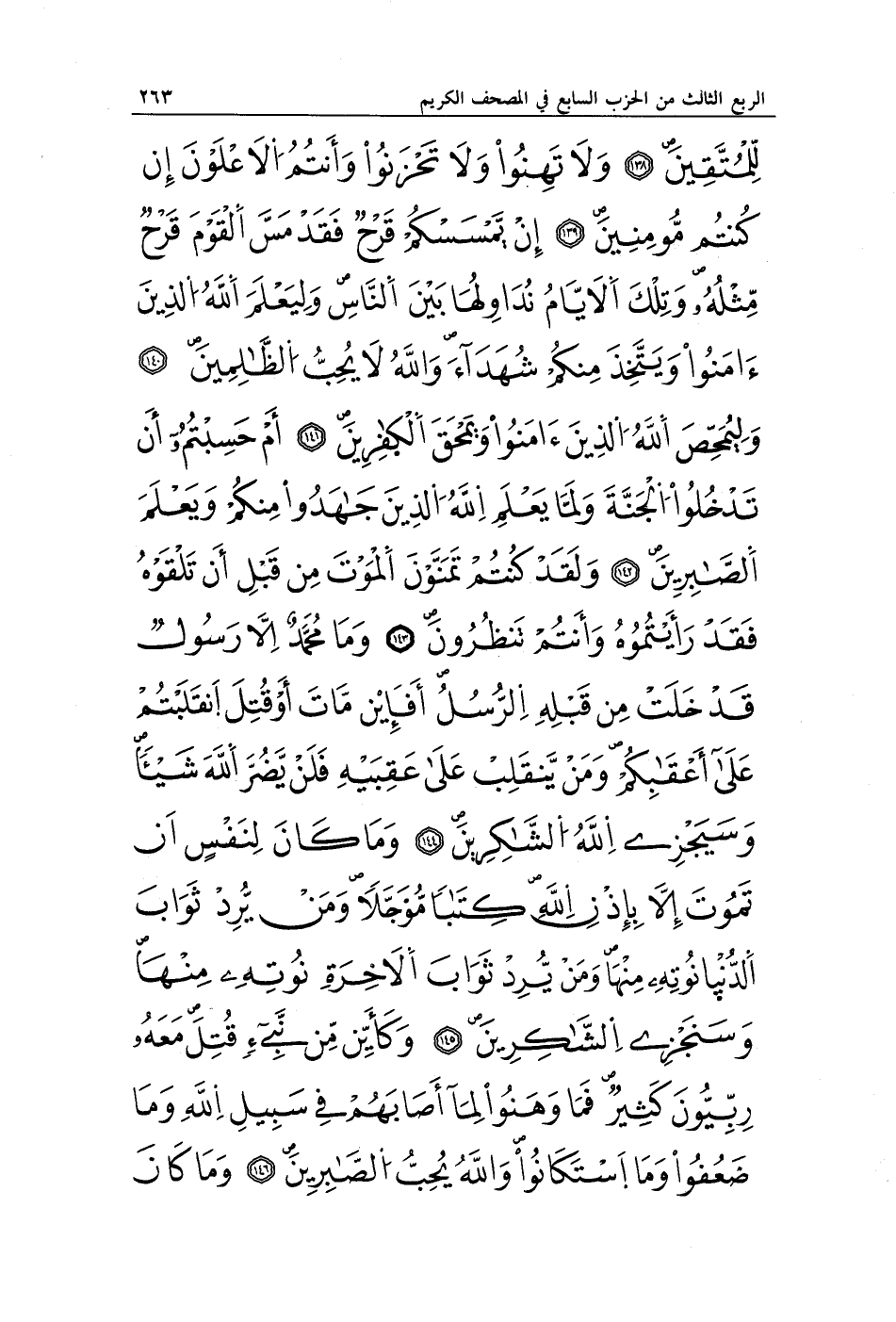 لِلْمُتَّقِينَ (138) وَلَا تَهِنُوا وَلَا تَحْزَنُوا وَأَنْتُمُ الْأَعْلَوْنَ إِنْ كُنْتُمْ مُؤْمِنِينَ (139) إِنْ يَمْسَسْكُمْ قَرْحٌ فَقَدْ مَسَّ الْقَوْمَ قَرْحٌ مِثْلُهُ وَتِلْكَ الْأَيَّامُ نُدَاوِلُهَا بَيْنَ النَّاسِ وَلِيَعْلَمَ اللَّهُ الَّذِينَ آمَنُوا وَيَتَّخِذَ مِنْكُمْ شُهَدَاءَ وَاللَّهُ لَا يُحِبُّ الظَّالِمِينَ (140) وَلِيُمَحِّصَ اللَّهُ الَّذِينَ آمَنُوا وَيَمْحَقَ الْكَافِرِينَ (141) أَمْ حَسِبْتُمْ أَنْ تَدْخُلُوا الْجَنَّةَ وَلَمَّا يَعْلَمِ اللَّهُ الَّذِينَ جَاهَدُوا مِنْكُمْ وَيَعْلَمَ الصَّابِرِينَ (142) وَلَقَدْ كُنْتُمْ تَمَنَّوْنَ الْمَوْتَ مِنْ قَبْلِ أَنْ تَلْقَوْهُ فَقَدْ رَأَيْتُمُوهُ وَأَنْتُمْ تَنْظُرُونَ (143) وَمَا مُحَمَّدٌ إِلَّا رَسُولٌ قَدْ خَلَتْ مِنْ قَبْلِهِ الرُّسُلُ أَفَإِنْ مَاتَ أَوْ قُتِلَ انْقَلَبْتُمْ عَلَى أَعْقَابِكُمْ وَمَنْ يَنْقَلِبْ عَلَى عَقِبَيْهِ فَلَنْ يَضُرَّ اللَّهَ شَيْئًا وَسَيَجْزِي اللَّهُ الشَّاكِرِينَ (144) وَمَا كَانَ لِنَفْسٍ أَنْ تَمُوتَ إِلَّا بِإِذْنِ اللَّهِ كِتَابًا مُؤَجَّلًا وَمَنْ يُرِدْ ثَوَابَ الدُّنْيَا نُؤْتِهِ مِنْهَا وَمَنْ يُرِدْ ثَوَابَ الْآخِرَةِ نُؤْتِهِ مِنْهَا وَسَنَجْزِي الشَّاكِرِينَ (145) وَكَأَيِّنْ مِنْ نَبِيٍّ قَاتَلَ مَعَهُ رِبِّيُّونَ كَثِيرٌ فَمَا وَهَنُوا لِمَا أَصَابَهُمْ فِي سَبِيلِ اللَّهِ وَمَا ضَعُفُوا وَمَا اسْتَكَانُوا وَاللَّهُ يُحِبُّ الصَّابِرِينَ (146) وَمَا كَانَ
