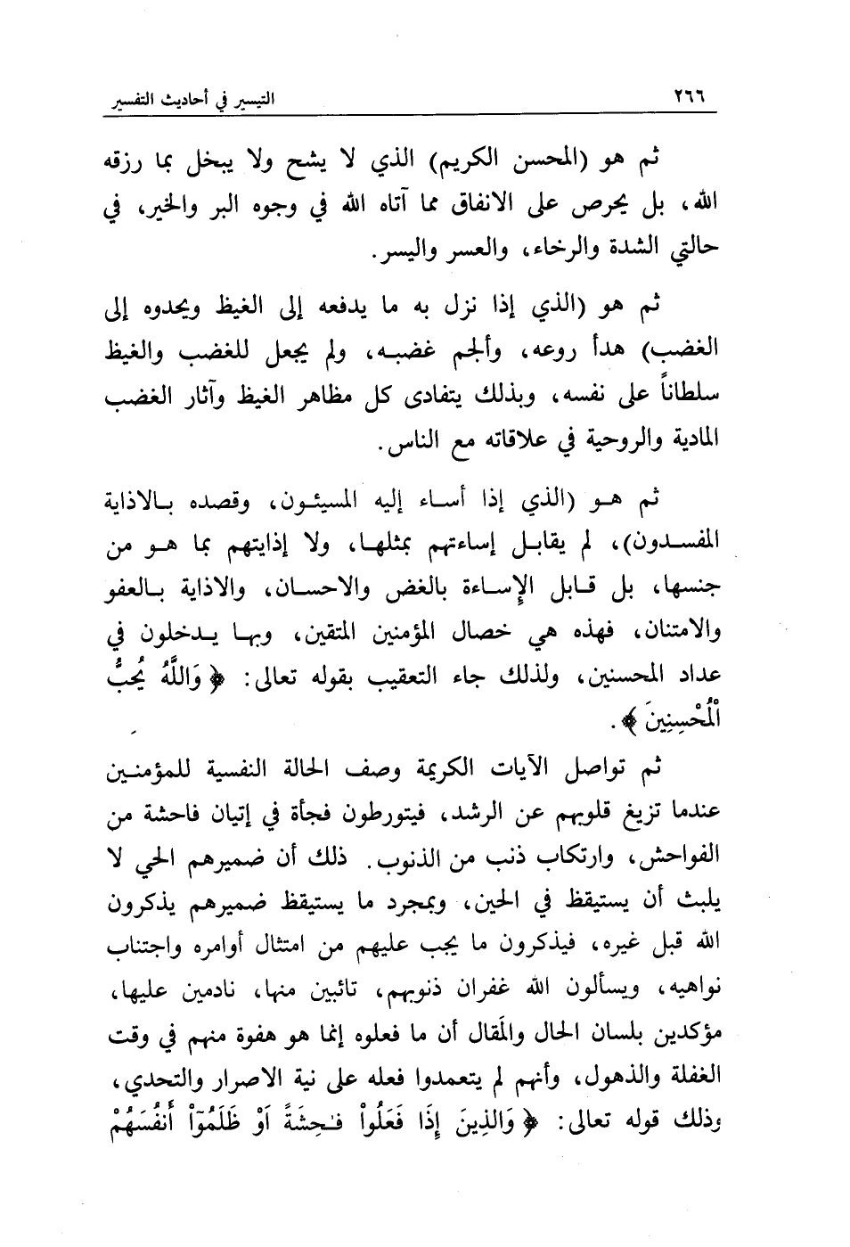 ثم هو (الذي إذا أساء إليه المسيئون، وقصده بالإذاية المفسدون)، لم يقابل إساءتهم بمثلها، ولا إذايتهم بما هو من جنسها، بل قابل الإساءة بالغض والإحسان، والإذاية بالعفو والامتنان، فهذه هي خصال المؤمنين المتقين، وبها يدخلون في عداد المحسنين، ولذلك جاء التعقيب بقوله تعالى: {وَاللَّهُ يُحِبُّ الْمُحْسِنِينَ}.