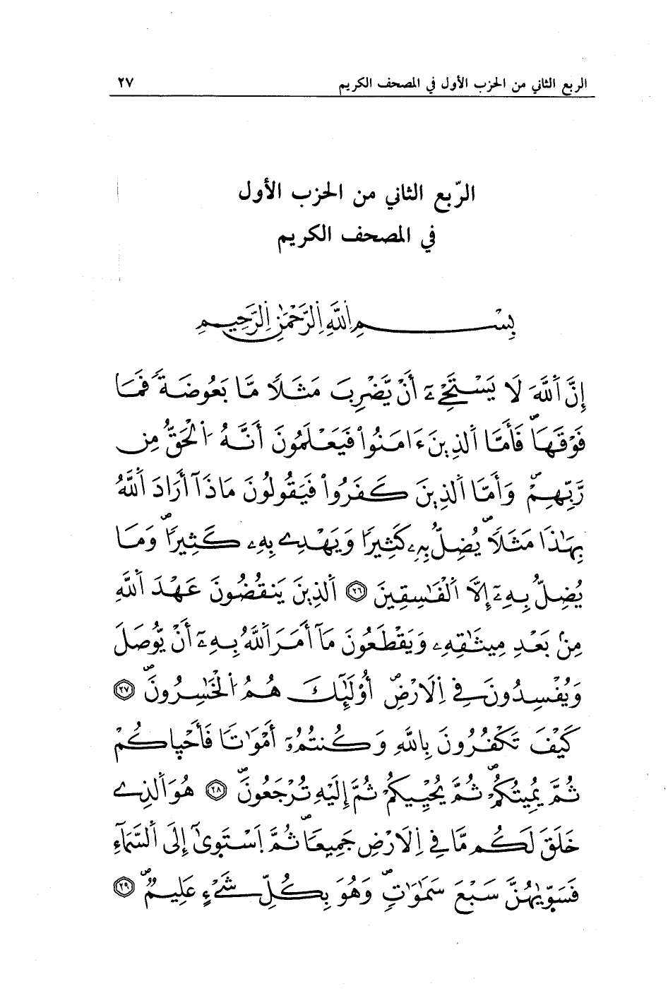 إِنَّ اللَّهَ لَا يَسْتَحْيِي أَنْ يَضْرِبَ مَثَلًا مَا بَعُوضَةً فَمَا فَوْقَهَا فَأَمَّا الَّذِينَ آمَنُوا فَيَعْلَمُونَ أَنَّهُ الْحَقُّ مِنْ رَبِّهِمْ وَأَمَّا الَّذِينَ كَفَرُوا فَيَقُولُونَ مَاذَا أَرَادَ اللَّهُ بِهَذَا مَثَلًا يُضِلُّ بِهِ كَثِيرًا وَيَهْدِي بِهِ كَثِيرًا وَمَا يُضِلُّ بِهِ إِلَّا الْفَاسِقِينَ (26) الَّذِينَ يَنْقُضُونَ عَهْدَ اللَّهِ مِنْ بَعْدِ مِيثَاقِهِ وَيَقْطَعُونَ مَا أَمَرَ اللَّهُ بِهِ أَنْ يُوصَلَ وَيُفْسِدُونَ فِي الْأَرْضِ أُولَئِكَ هُمُ الْخَاسِرُونَ (27) كَيْفَ تَكْفُرُونَ بِاللَّهِ وَكُنْتُمْ أَمْوَاتًا فَأَحْيَاكُمْ ثُمَّ يُمِيتُكُمْ ثُمَّ يُحْيِيكُمْ ثُمَّ إِلَيْهِ تُرْجَعُونَ (28) هُوَ الَّذِي خَلَقَ لَكُمْ مَا فِي الْأَرْضِ جَمِيعًا ثُمَّ اسْتَوَى إِلَى السَّمَاءِ فَسَوَّاهُنَّ سَبْعَ سَمَاوَاتٍ وَهُوَ بِكُلِّ شَيْءٍ عَلِيمٌ (29)