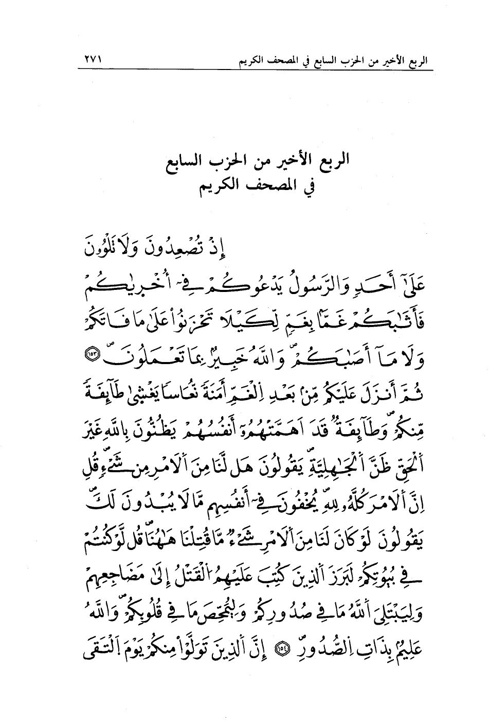 إِذْ تُصْعِدُونَ وَلَا تَلْوُونَ عَلَى أَحَدٍ وَالرَّسُولُ يَدْعُوكُمْ فِي أُخْرَاكُمْ فَأَثَابَكُمْ غَمًّا بِغَمٍّ لِكَيْلَا تَحْزَنُوا عَلَى مَا فَاتَكُمْ وَلَا مَا أَصَابَكُمْ وَاللَّهُ خَبِيرٌ بِمَا تَعْمَلُونَ (153) ثُمَّ أَنْزَلَ عَلَيْكُمْ مِنْ بَعْدِ الْغَمِّ أَمَنَةً نُعَاسًا يَغْشَى طَائِفَةً مِنْكُمْ وَطَائِفَةٌ قَدْ أَهَمَّتْهُمْ أَنْفُسُهُمْ يَظُنُّونَ بِاللَّهِ غَيْرَ الْحَقِّ ظَنَّ الْجَاهِلِيَّةِ يَقُولُونَ هَلْ لَنَا مِنَ الْأَمْرِ مِنْ شَيْءٍ قُلْ إِنَّ الْأَمْرَ كُلَّهُ لِلَّهِ يُخْفُونَ فِي أَنْفُسِهِمْ مَا لَا يُبْدُونَ لَكَ يَقُولُونَ لَوْ كَانَ لَنَا مِنَ الْأَمْرِ شَيْءٌ مَا قُتِلْنَا هَاهُنَا قُلْ لَوْ كُنْتُمْ فِي بُيُوتِكُمْ لَبَرَزَ الَّذِينَ كُتِبَ عَلَيْهِمُ الْقَتْلُ إِلَى مَضَاجِعِهِمْ وَلِيَبْتَلِيَ اللَّهُ مَا فِي صُدُورِكُمْ وَلِيُمَحِّصَ مَا فِي قُلُوبِكُمْ وَاللَّهُ عَلِيمٌ بِذَاتِ الصُّدُورِ (154) إِنَّ الَّذِينَ تَوَلَّوْا مِنْكُمْ يَوْمَ الْتَقَى