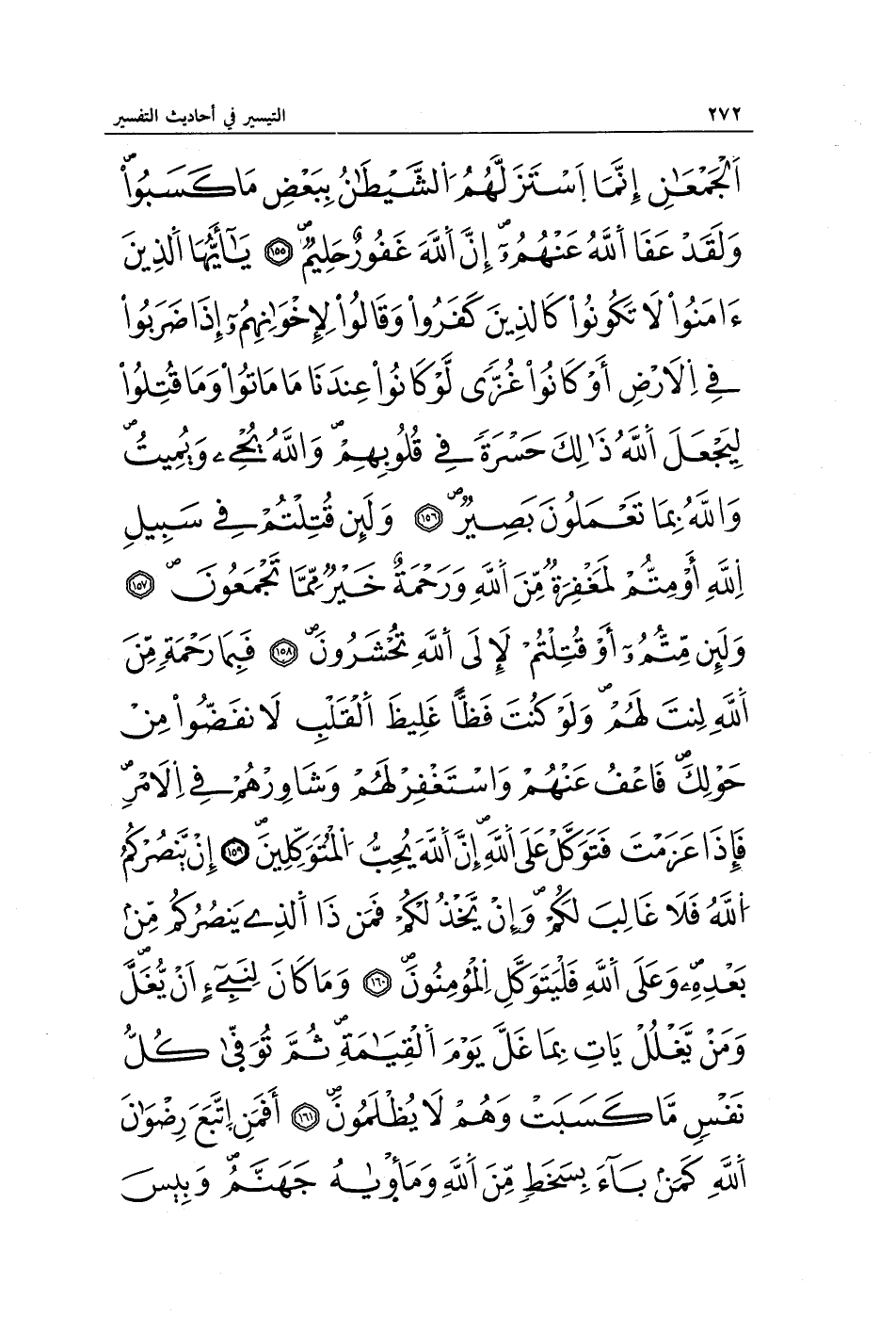الْجَمْعَانِ إِنَّمَا اسْتَزَلَّهُمُ الشَّيْطَانُ بِبَعْضِ مَا كَسَبُوا وَلَقَدْ عَفَا اللَّهُ عَنْهُمْ إِنَّ اللَّهَ غَفُورٌ حَلِيمٌ (155) يَا أَيُّهَا الَّذِينَ آمَنُوا لَا تَكُونُوا كَالَّذِينَ كَفَرُوا وَقَالُوا لِإِخْوَانِهِمْ إِذَا ضَرَبُوا فِي الْأَرْضِ أَوْ كَانُوا غُزًّى لَوْ كَانُوا عِنْدَنَا مَا مَاتُوا وَمَا قُتِلُوا لِيَجْعَلَ اللَّهُ ذَلِكَ حَسْرَةً فِي قُلُوبِهِمْ وَاللَّهُ يُحْيِي وَيُمِيتُ وَاللَّهُ بِمَا تَعْمَلُونَ بَصِيرٌ (156) وَلَئِنْ قُتِلْتُمْ فِي سَبِيلِ اللَّهِ أَوْ مُتُّمْ لَمَغْفِرَةٌ مِنَ اللَّهِ وَرَحْمَةٌ خَيْرٌ مِمَّا يَجْمَعُونَ (157) وَلَئِنْ مُتُّمْ أَوْ قُتِلْتُمْ لَإِلَى اللَّهِ تُحْشَرُونَ (158) فَبِمَا رَحْمَةٍ مِنَ اللَّهِ لِنْتَ لَهُمْ وَلَوْ كُنْتَ فَظًّا غَلِيظَ الْقَلْبِ لَانْفَضُّوا مِنْ حَوْلِكَ فَاعْفُ عَنْهُمْ وَاسْتَغْفِرْ لَهُمْ وَشَاوِرْهُمْ فِي الْأَمْرِ فَإِذَا عَزَمْتَ فَتَوَكَّلْ عَلَى اللَّهِ إِنَّ اللَّهَ يُحِبُّ الْمُتَوَكِّلِينَ (159) إِنْ يَنْصُرْكُمُ اللَّهُ فَلَا غَالِبَ لَكُمْ وَإِنْ يَخْذُلْكُمْ فَمَنْ ذَا الَّذِي يَنْصُرُكُمْ مِنْ بَعْدِهِ وَعَلَى اللَّهِ فَلْيَتَوَكَّلِ الْمُؤْمِنُونَ (160) وَمَا كَانَ لِنَبِيٍّ أَنْ يَغُلَّ وَمَنْ يَغْلُلْ يَأْتِ بِمَا غَلَّ يَوْمَ الْقِيَامَةِ ثُمَّ تُوَفَّى كُلُّ نَفْسٍ مَا كَسَبَتْ وَهُمْ لَا يُظْلَمُونَ (161) أَفَمَنِ اتَّبَعَ رِضْوَانَ اللَّهِ كَمَنْ بَاءَ بِسَخَطٍ مِنَ اللَّهِ وَمَأْوَاهُ جَهَنَّمُ وَبِئْسَ