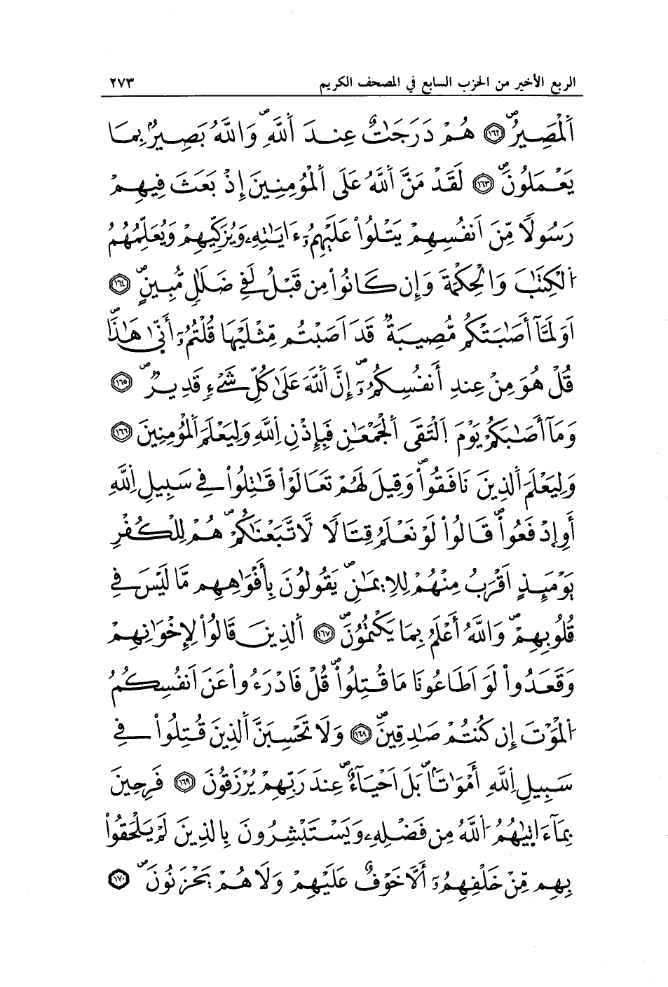 الْمَصِيرُ (162) هُمْ دَرَجَاتٌ عِنْدَ اللَّهِ وَاللَّهُ بَصِيرٌ بِمَا يَعْمَلُونَ (163) لَقَدْ مَنَّ اللَّهُ عَلَى الْمُؤْمِنِينَ إِذْ بَعَثَ فِيهِمْ رَسُولًا مِنْ أَنْفُسِهِمْ يَتْلُو عَلَيْهِمْ آيَاتِهِ وَيُزَكِّيهِمْ وَيُعَلِّمُهُمُ الْكِتَابَ وَالْحِكْمَةَ وَإِنْ كَانُوا مِنْ قَبْلُ لَفِي ضَلَالٍ مُبِينٍ (164) أَوَلَمَّا أَصَابَتْكُمْ مُصِيبَةٌ قَدْ أَصَبْتُمْ مِثْلَيْهَا قُلْتُمْ أَنَّى هَذَا قُلْ هُوَ مِنْ عِنْدِ أَنْفُسِكُمْ إِنَّ اللَّهَ عَلَى كُلِّ شَيْءٍ قَدِيرٌ (165) وَمَا أَصَابَكُمْ يَوْمَ الْتَقَى الْجَمْعَانِ فَبِإِذْنِ اللَّهِ وَلِيَعْلَمَ الْمُؤْمِنِينَ (166) وَلِيَعْلَمَ الَّذِينَ نَافَقُوا وَقِيلَ لَهُمْ تَعَالَوْا قَاتِلُوا فِي سَبِيلِ اللَّهِ أَوِ ادْفَعُوا قَالُوا لَوْ نَعْلَمُ قِتَالًا لَاتَّبَعْنَاكُمْ هُمْ لِلْكُفْرِ يَوْمَئِذٍ أَقْرَبُ مِنْهُمْ لِلْإِيمَانِ يَقُولُونَ بِأَفْوَاهِهِمْ مَا لَيْسَ فِي قُلُوبِهِمْ وَاللَّهُ أَعْلَمُ بِمَا يَكْتُمُونَ (167) الَّذِينَ قَالُوا لِإِخْوَانِهِمْ وَقَعَدُوا لَوْ أَطَاعُونَا مَا قُتِلُوا قُلْ فَادْرَءُوا عَنْ أَنْفُسِكُمُ الْمَوْتَ إِنْ كُنْتُمْ صَادِقِينَ (168) وَلَا تَحْسَبَنَّ الَّذِينَ قُتِلُوا فِي سَبِيلِ اللَّهِ أَمْوَاتًا بَلْ أَحْيَاءٌ عِنْدَ رَبِّهِمْ يُرْزَقُونَ (169) فَرِحِينَ بِمَا آتَاهُمُ اللَّهُ مِنْ فَضْلِهِ وَيَسْتَبْشِرُونَ بِالَّذِينَ لَمْ يَلْحَقُوا بِهِمْ مِنْ خَلْفِهِمْ أَلَّا خَوْفٌ عَلَيْهِمْ وَلَا هُمْ يَحْزَنُونَ (170)