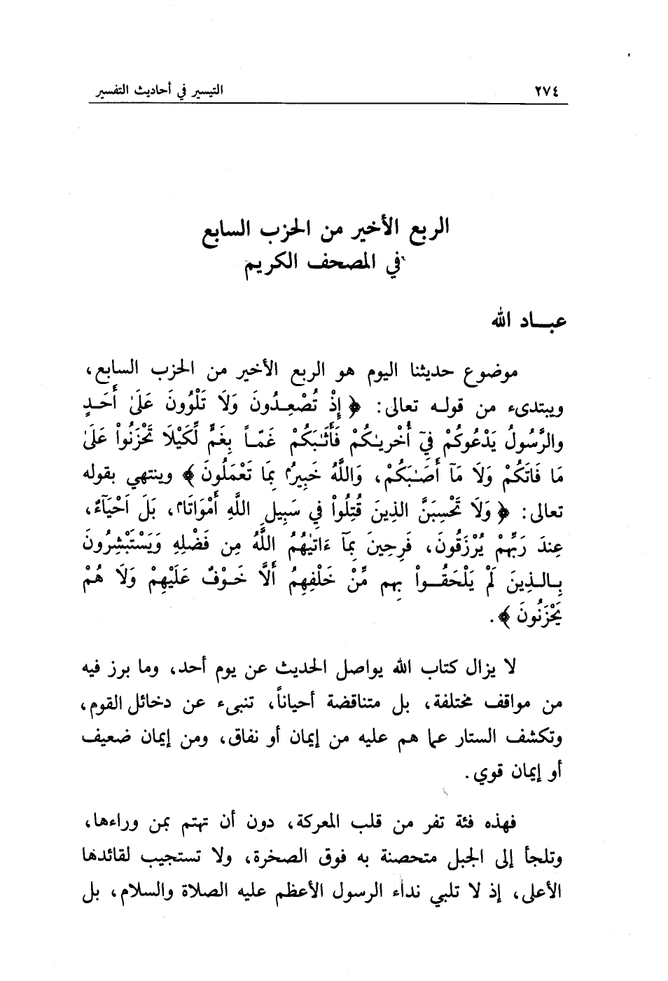 موضوع حديثنا اليوم هو الربع الأخير عن الحزب السابع، ويبتدئ، من قوله تعالى: {إِذْ تُصْعِدُونَ وَلَا تَلْوُونَ عَلَى أَحَدٍ وَالرَّسُولُ يَدْعُوكُمْ فِي أُخْرَاكُمْ فَأَثَابَكُمْ غَمًّا بِغَمٍّ لِكَيْلَا تَحْزَنُوا عَلَى مَا فَاتَكُمْ وَلَا مَا أَصَابَكُمْ وَاللَّهُ خَبِيرٌ بِمَا تَعْمَلُونَ} وينتهي بقوله تعالى: {وَلَا تَحْسَبَنَّ الَّذِينَ قُتِلُوا فِي سَبِيلِ اللَّهِ أَمْوَاتًا بَلْ أَحْيَاءٌ عِنْدَ رَبِّهِمْ يُرْزَقُونَ * فَرِحِينَ بِمَا آتَاهُمُ اللَّهُ مِنْ فَضْلِهِ وَيَسْتَبْشِرُونَ بِالَّذِينَ لَمْ يَلْحَقُوا بِهِمْ مِنْ خَلْفِهِمْ أَلَّا خَوْفٌ عَلَيْهِمْ وَلَا هُمْ يَحْزَنُونَ}