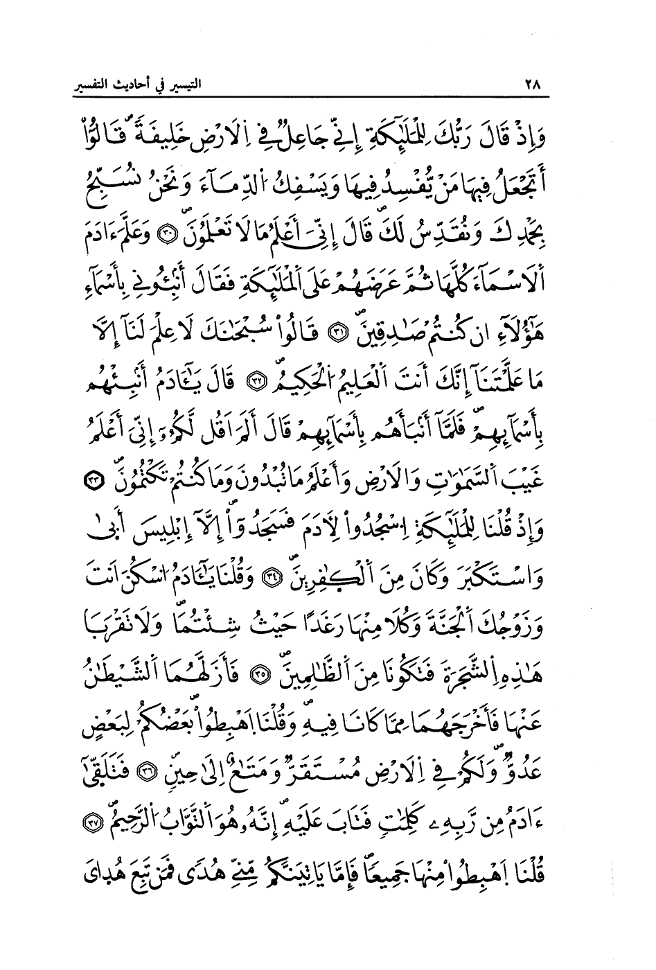 وَإِذْ قَالَ رَبُّكَ لِلْمَلَائِكَةِ إِنِّي جَاعِلٌ فِي الْأَرْضِ خَلِيفَةً قَالُوا أَتَجْعَلُ فِيهَا مَنْ يُفْسِدُ فِيهَا وَيَسْفِكُ الدِّمَاءَ وَنَحْنُ نُسَبِّحُ بِحَمْدِكَ وَنُقَدِّسُ لَكَ قَالَ إِنِّي أَعْلَمُ مَا لَا تَعْلَمُونَ (30) وَعَلَّمَ آدَمَ الْأَسْمَاءَ كُلَّهَا ثُمَّ عَرَضَهُمْ عَلَى الْمَلَائِكَةِ فَقَالَ أَنْبِئُونِي بِأَسْمَاءِ هَؤُلَاءِ إِنْ كُنْتُمْ صَادِقِينَ (31) قَالُوا سُبْحَانَكَ لَا عِلْمَ لَنَا إِلَّا مَا عَلَّمْتَنَا إِنَّكَ أَنْتَ الْعَلِيمُ الْحَكِيمُ (32) قَالَ يَا آدَمُ أَنْبِئْهُمْ بِأَسْمَائِهِمْ فَلَمَّا أَنْبَأَهُمْ بِأَسْمَائِهِمْ قَالَ أَلَمْ أَقُلْ لَكُمْ إِنِّي أَعْلَمُ غَيْبَ السَّمَاوَاتِ وَالْأَرْضِ وَأَعْلَمُ مَا تُبْدُونَ وَمَا كُنْتُمْ تَكْتُمُونَ (33) وَإِذْ قُلْنَا لِلْمَلَائِكَةِ اسْجُدُوا لِآدَمَ فَسَجَدُوا إِلَّا إِبْلِيسَ أَبَى وَاسْتَكْبَرَ وَكَانَ مِنَ الْكَافِرِينَ (34) وَقُلْنَا يَا آدَمُ اسْكُنْ أَنْتَ وَزَوْجُكَ الْجَنَّةَ وَكُلَا مِنْهَا رَغَدًا حَيْثُ شِئْتُمَا وَلَا تَقْرَبَا هَذِهِ الشَّجَرَةَ فَتَكُونَا مِنَ الظَّالِمِينَ (35) فَأَزَلَّهُمَا الشَّيْطَانُ عَنْهَا فَأَخْرَجَهُمَا مِمَّا كَانَا فِيهِ وَقُلْنَا اهْبِطُوا بَعْضُكُمْ لِبَعْضٍ عَدُوٌّ وَلَكُمْ فِي الْأَرْضِ مُسْتَقَرٌّ وَمَتَاعٌ إِلَى حِينٍ (36) فَتَلَقَّى آدَمُ مِنْ رَبِّهِ كَلِمَاتٍ فَتَابَ عَلَيْهِ إِنَّهُ هُوَ التَّوَّابُ الرَّحِيمُ (37) قُلْنَا اهْبِطُوا مِنْهَا جَمِيعًا فَإِمَّا يَأْتِيَنَّكُمْ مِنِّي هُدًى فَمَنْ تَبِعَ هُدَايَ