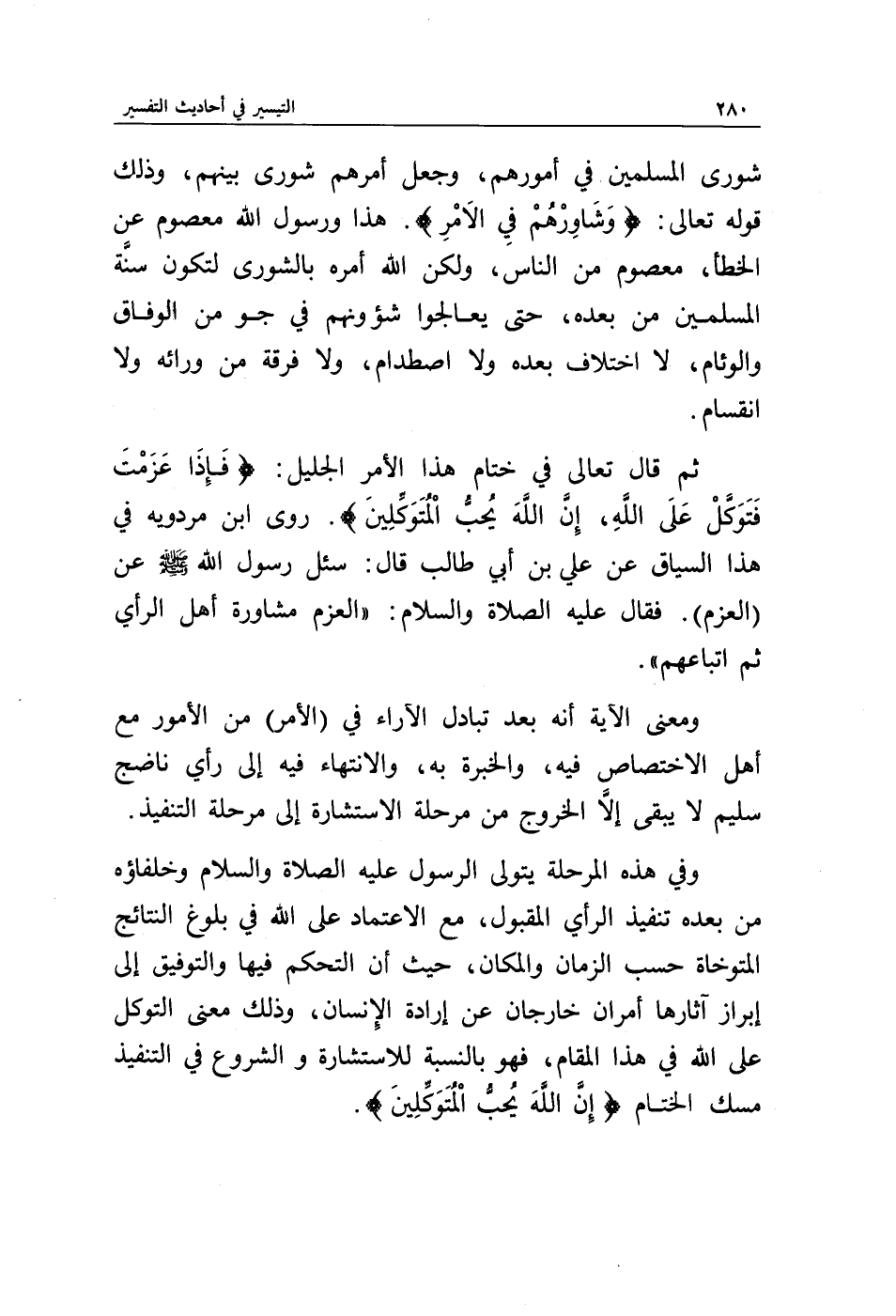 ثم قال تعالى في ختام هذا الأمر الجليل: {فَإِذَا عَزَمْتَ فَتَوَكَّلْ عَلَى اللَّهِ إِنَّ اللَّهَ يُحِبُّ الْمُتَوَكِّلِينَ}. روى ابن مردويه في هذا السياق عن علي ابن طالب قال: سئل رسول الله صلى الله عليه وسلم عن (العزم) فقال عليه الصلاة والسلام: " العزم مشاورة أهل الرأي ثم اتباعهم ".