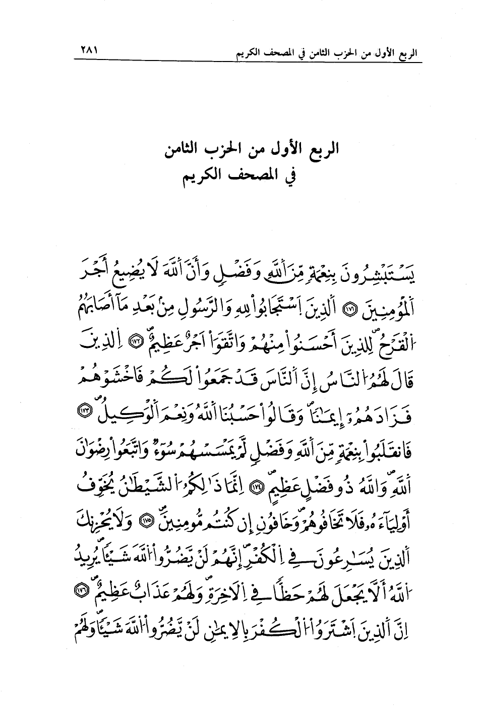 يَسْتَبْشِرُونَ بِنِعْمَةٍ مِنَ اللَّهِ وَفَضْلٍ وَأَنَّ اللَّهَ لَا يُضِيعُ أَجْرَ الْمُؤْمِنِينَ (171) الَّذِينَ اسْتَجَابُوا لِلَّهِ وَالرَّسُولِ مِنْ بَعْدِ مَا أَصَابَهُمُ الْقَرْحُ لِلَّذِينَ أَحْسَنُوا مِنْهُمْ وَاتَّقَوْا أَجْرٌ عَظِيمٌ (172) الَّذِينَ قَالَ لَهُمُ النَّاسُ إِنَّ النَّاسَ قَدْ جَمَعُوا لَكُمْ فَاخْشَوْهُمْ فَزَادَهُمْ إِيمَانًا وَقَالُوا حَسْبُنَا اللَّهُ وَنِعْمَ الْوَكِيلُ (173) فَانْقَلَبُوا بِنِعْمَةٍ مِنَ اللَّهِ وَفَضْلٍ لَمْ يَمْسَسْهُمْ سُوءٌ وَاتَّبَعُوا رِضْوَانَ اللَّهِ وَاللَّهُ ذُو فَضْلٍ عَظِيمٍ (174) إِنَّمَا ذَلِكُمُ الشَّيْطَانُ يُخَوِّفُ أَوْلِيَاءَهُ فَلَا تَخَافُوهُمْ وَخَافُونِ إِنْ كُنْتُمْ مُؤْمِنِينَ (175) وَلَا يَحْزُنْكَ الَّذِينَ يُسَارِعُونَ فِي الْكُفْرِ إِنَّهُمْ لَنْ يَضُرُّوا اللَّهَ شَيْئًا يُرِيدُ اللَّهُ أَلَّا يَجْعَلَ لَهُمْ حَظًّا فِي الْآخِرَةِ وَلَهُمْ عَذَابٌ عَظِيمٌ (176) إِنَّ الَّذِينَ اشْتَرَوُا الْكُفْرَ بِالْإِيمَانِ لَنْ يَضُرُّوا اللَّهَ شَيْئًا وَلَهُمْ