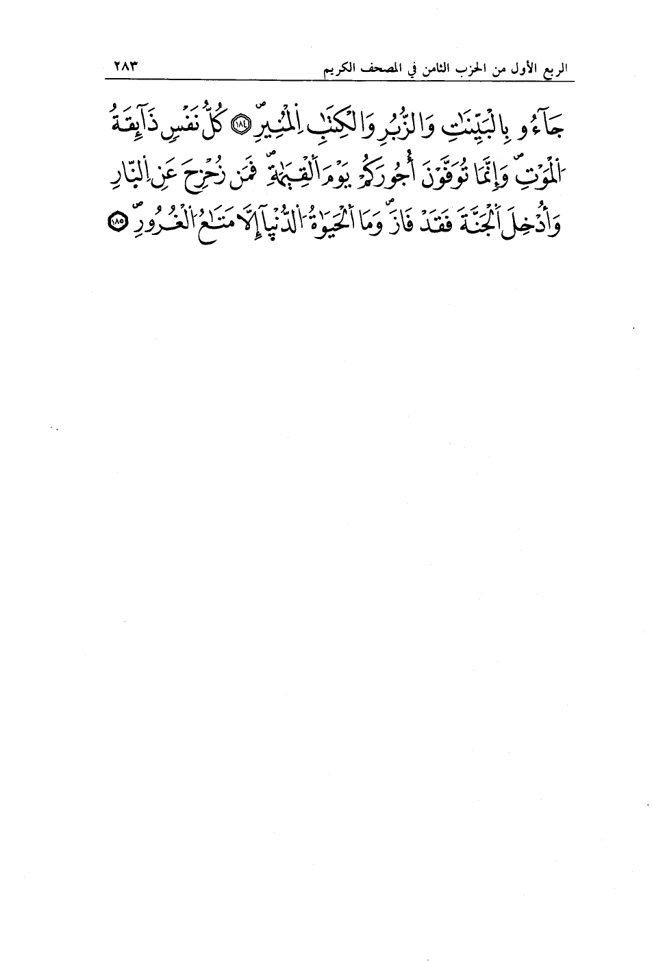 جَاءُوا بِالْبَيِّنَاتِ وَالزُّبُرِ وَالْكِتَابِ الْمُنِيرِ (184) كُلُّ نَفْسٍ ذَائِقَةُ الْمَوْتِ وَإِنَّمَا تُوَفَّوْنَ أُجُورَكُمْ يَوْمَ الْقِيَامَةِ فَمَنْ زُحْزِحَ عَنِ النَّارِ وَأُدْخِلَ الْجَنَّةَ فَقَدْ فَازَ وَمَا الْحَيَاةُ الدُّنْيَا إِلَّا مَتَاعُ الْغُرُورِ (185)