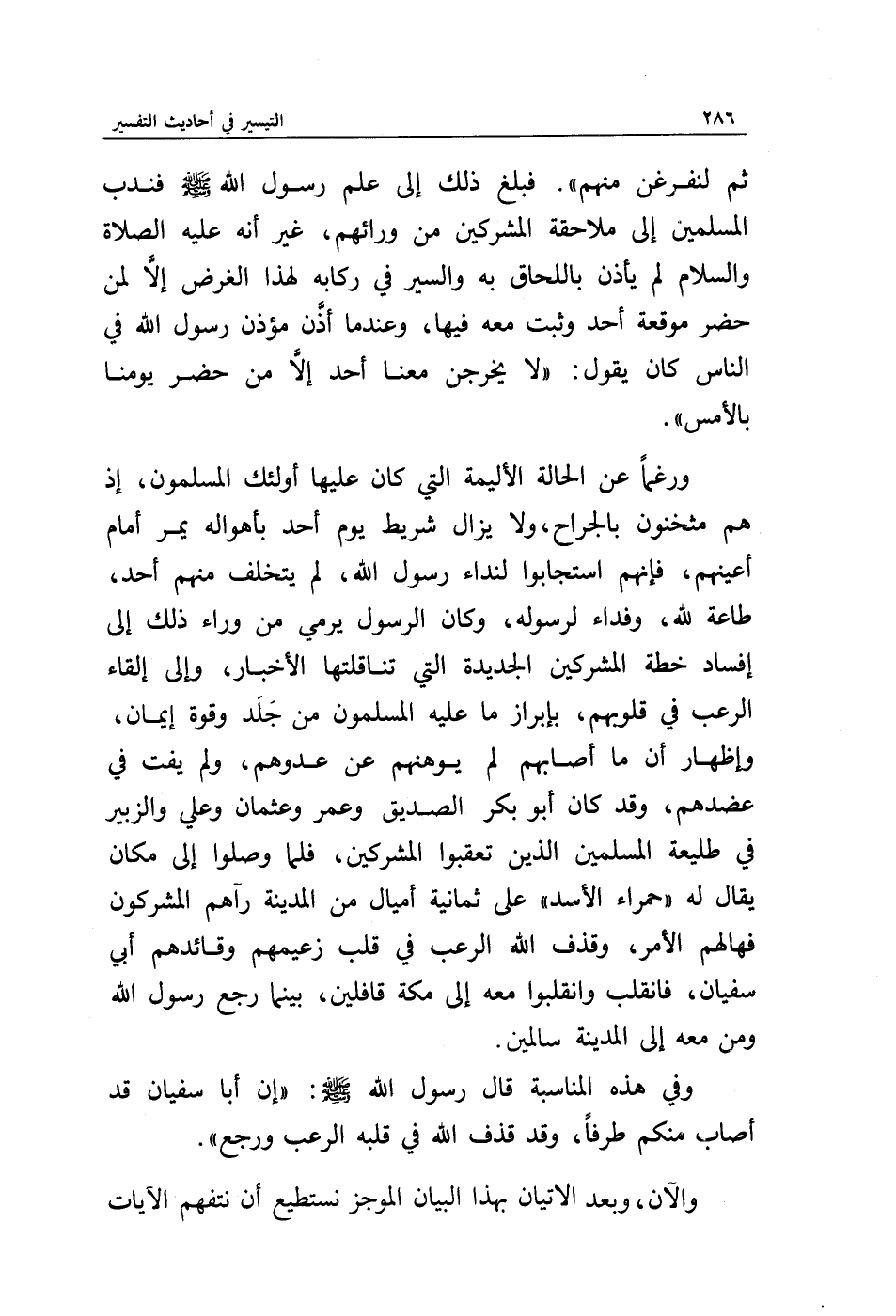 وفي هذه المناسبة قال رسول الله صلى الله عليه وسلم: " إن أبا سفيان قد أصاب منكم طرفا، وقد قذف الله في قلبه الرعب ورجع ".
