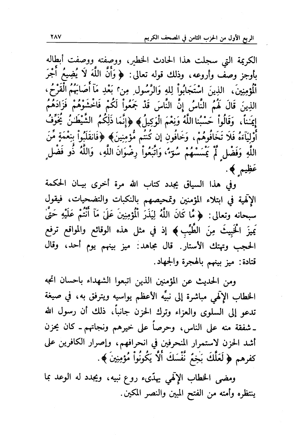 وفي هذا السياق يجدد كتاب الله مرة أخرى بيان الحكمة الإلهية في ابتلاء المؤمنين وتمحيصهم بالنكبات والتضحيات، فيقول سبحانه وتعالى: {مَا كَانَ اللَّهُ لِيَذَرَ الْمُؤْمِنِينَ عَلَى مَا أَنْتُمْ عَلَيْهِ حَتَّى يَمِيزَ الْخَبِيثَ مِنَ الطَّيِّبِ}. إذ في مثل هذه الوقائع والمواقع ترفع الحجب وتهتك الأستار. قال مجاهد: ميز بينهم يوم أحد، وقال قتادة: ميز بينهم بالهجرة والجهاد.