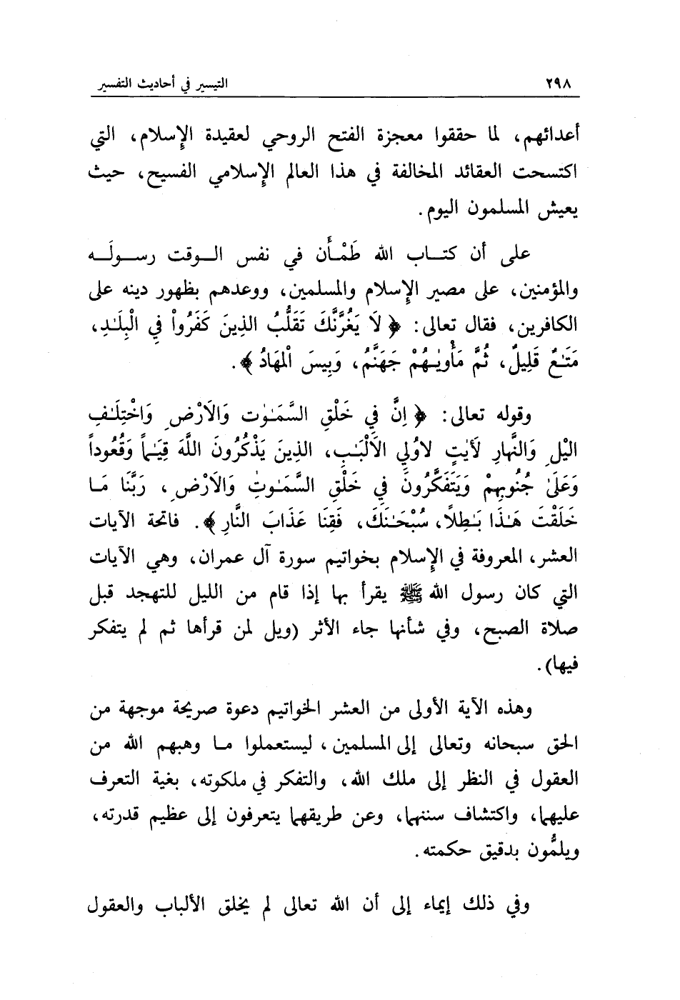 وقوله تعالى: {إِنَّ فِي خَلْقِ السَّمَاوَاتِ وَالْأَرْضِ وَاخْتِلَافِ اللَّيْلِ وَالنَّهَارِ لَآيَاتٍ لِأُولِي الْأَلْبَابِ * الَّذِينَ يَذْكُرُونَ اللَّهَ قِيَامًا وَقُعُودًا وَعَلَى جُنُوبِهِمْ وَيَتَفَكَّرُونَ فِي خَلْقِ السَّمَاوَاتِ وَالْأَرْضِ رَبَّنَا مَا خَلَقْتَ هَذَا بَاطِلًا سُبْحَانَكَ فَقِنَا عَذَابَ النَّارِ}. فاتحة الآيات العشر، المعروفة في الإسلام بخواتيم سورة آل عمران، وهي الآيات التي كان رسول الله عليه الصلاة والسلام يقرأ بها إذا قام من الليل للتهجد قبل صلاة الصبح، وفي شأنها جاء الأثر (ويل لمن قرأها ثم لم يتفكر فيها).