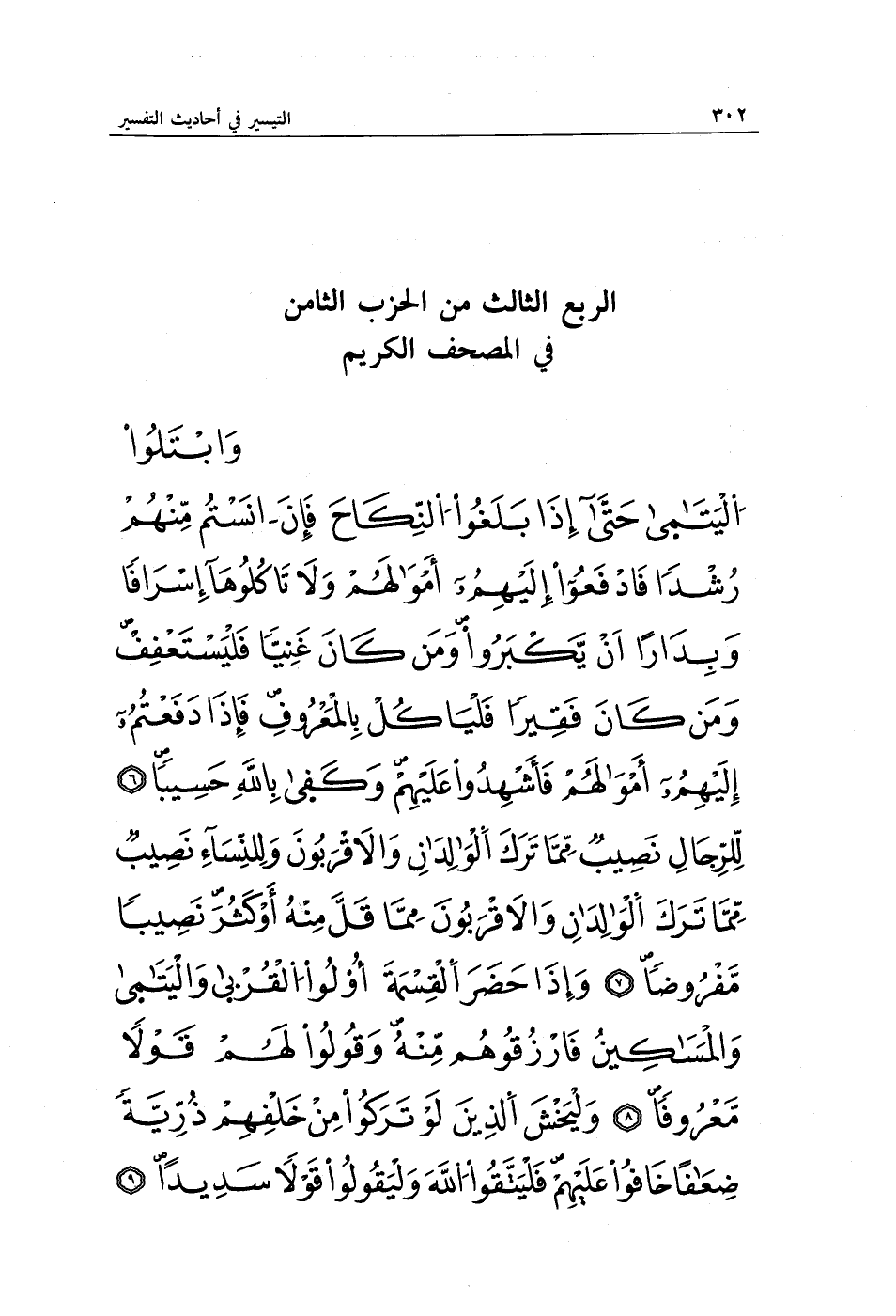 وَابْتَلُوا الْيَتَامَى حَتَّى إِذَا بَلَغُوا النِّكَاحَ فَإِنْ آنَسْتُمْ مِنْهُمْ رُشْدًا فَادْفَعُوا إِلَيْهِمْ أَمْوَالَهُمْ وَلَا تَأْكُلُوهَا إِسْرَافًا وَبِدَارًا أَنْ يَكْبَرُوا وَمَنْ كَانَ غَنِيًّا فَلْيَسْتَعْفِفْ وَمَنْ كَانَ فَقِيرًا فَلْيَأْكُلْ بِالْمَعْرُوفِ فَإِذَا دَفَعْتُمْ إِلَيْهِمْ أَمْوَالَهُمْ فَأَشْهِدُوا عَلَيْهِمْ وَكَفَى بِاللَّهِ حَسِيبًا (6) لِلرِّجَالِ نَصِيبٌ مِمَّا تَرَكَ الْوَالِدَانِ وَالْأَقْرَبُونَ وَلِلنِّسَاءِ نَصِيبٌ مِمَّا تَرَكَ الْوَالِدَانِ وَالْأَقْرَبُونَ مِمَّا قَلَّ مِنْهُ أَوْ كَثُرَ نَصِيبًا مَفْرُوضًا (7) وَإِذَا حَضَرَ الْقِسْمَةَ أُولُو الْقُرْبَى وَالْيَتَامَى وَالْمَسَاكِينُ فَارْزُقُوهُمْ مِنْهُ وَقُولُوا لَهُمْ قَوْلًا مَعْرُوفًا (8) وَلْيَخْشَ الَّذِينَ لَوْ تَرَكُوا مِنْ خَلْفِهِمْ ذُرِّيَّةً ضِعَافًا خَافُوا عَلَيْهِمْ فَلْيَتَّقُوا اللَّهَ وَلْيَقُولُوا قَوْلًا سَدِيدًا (9)