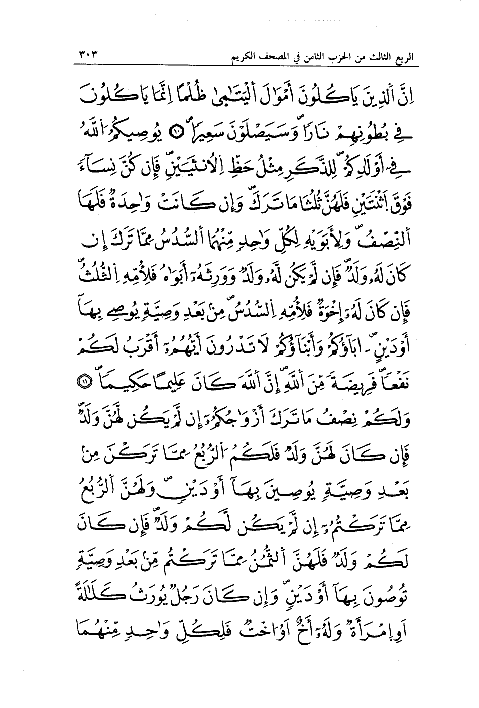 إِنَّ الَّذِينَ يَأْكُلُونَ أَمْوَالَ الْيَتَامَى ظُلْمًا إِنَّمَا يَأْكُلُونَ فِي بُطُونِهِمْ نَارًا وَسَيَصْلَوْنَ سَعِيرًا (10) يُوصِيكُمُ اللَّهُ فِي أَوْلَادِكُمْ لِلذَّكَرِ مِثْلُ حَظِّ الْأُنْثَيَيْنِ فَإِنْ كُنَّ نِسَاءً فَوْقَ اثْنَتَيْنِ فَلَهُنَّ ثُلُثَا مَا تَرَكَ وَإِنْ كَانَتْ وَاحِدَةً فَلَهَا النِّصْفُ وَلِأَبَوَيْهِ لِكُلِّ وَاحِدٍ مِنْهُمَا السُّدُسُ مِمَّا تَرَكَ إِنْ كَانَ لَهُ وَلَدٌ فَإِنْ لَمْ يَكُنْ لَهُ وَلَدٌ وَوَرِثَهُ أَبَوَاهُ فَلِأُمِّهِ الثُّلُثُ فَإِنْ كَانَ لَهُ إِخْوَةٌ فَلِأُمِّهِ السُّدُسُ مِنْ بَعْدِ وَصِيَّةٍ يُوصِي بِهَا أَوْ دَيْنٍ آبَاؤُكُمْ وَأَبْنَاؤُكُمْ لَا تَدْرُونَ أَيُّهُمْ أَقْرَبُ لَكُمْ نَفْعًا فَرِيضَةً مِنَ اللَّهِ إِنَّ اللَّهَ كَانَ عَلِيمًا حَكِيمًا (11) وَلَكُمْ نِصْفُ مَا تَرَكَ أَزْوَاجُكُمْ إِنْ لَمْ يَكُنْ لَهُنَّ وَلَدٌ فَإِنْ كَانَ لَهُنَّ وَلَدٌ فَلَكُمُ الرُّبُعُ مِمَّا تَرَكْنَ مِنْ بَعْدِ وَصِيَّةٍ يُوصِينَ بِهَا أَوْ دَيْنٍ وَلَهُنَّ الرُّبُعُ مِمَّا تَرَكْتُمْ إِنْ لَمْ يَكُنْ لَكُمْ وَلَدٌ فَإِنْ كَانَ لَكُمْ وَلَدٌ فَلَهُنَّ الثُّمُنُ مِمَّا تَرَكْتُمْ مِنْ بَعْدِ وَصِيَّةٍ تُوصُونَ بِهَا أَوْ دَيْنٍ وَإِنْ كَانَ رَجُلٌ يُورَثُ كَلَالَةً أَوِ امْرَأَةٌ وَلَهُ أَخٌ أَوْ أُخْتٌ فَلِكُلِّ وَاحِدٍ مِنْهُمَا