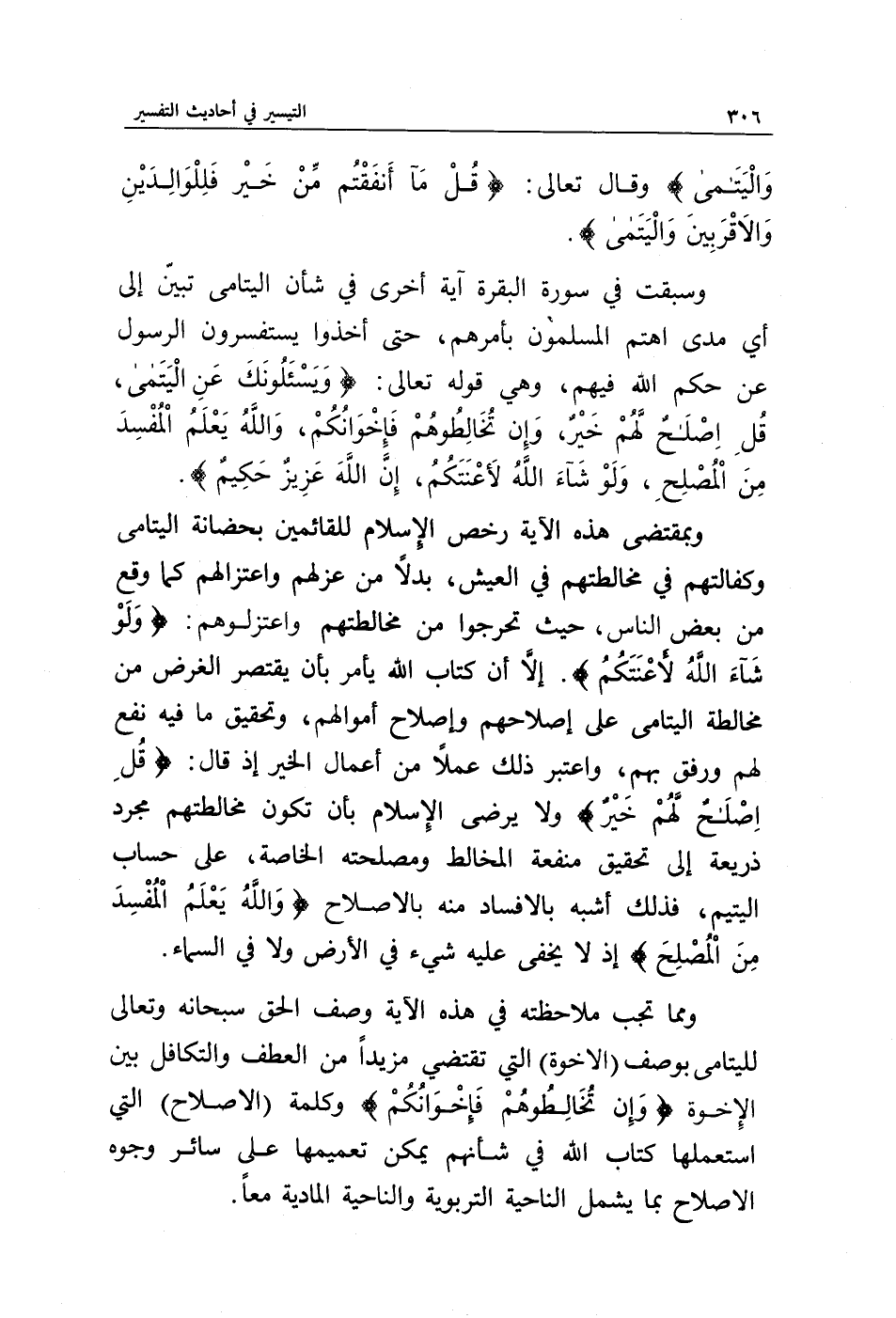 وبمقتضى هذه الآية رخص الإسلام للقائمين بحضانة اليتامى وكفالتهم في مخالطتهم في العيش، بدلا من عزلهم واعتزالهم كما وقع من بعض الناس، حيث تحرجوا من مخالطتهم واعتزلوهم {وَلَوْ شَاءَ اللَّهُ لَأَعْنَتَكُمْ} إلا أن كتاب الله يأمر بأن يقتصر الغرض من مخالطة اليتامى على إصلاحهم وإصلاح أموالهم، وتحقيق ما فيه نفع لهم ورفق بهم، واعتبر ذلك عملا من أعمال الخير إذ قال: {قُلْ إِصْلَاحٌ لَهُمْ خَيْرٌ} ولا يرضى الإسلام بأن تكون مخالطتهم مجرد ذريعة إلى تحقيق منفعة المخالط ومصلحته الخاصة، على حساب اليتيم، فذلك أشبه بالإفساد منه بالإصلاح {وَاللَّهُ يَعْلَمُ الْمُفْسِدَ مِنَ الْمُصْلِحِ} إذ لا يخفى عليه شيء في الأرض ولا في السماء.