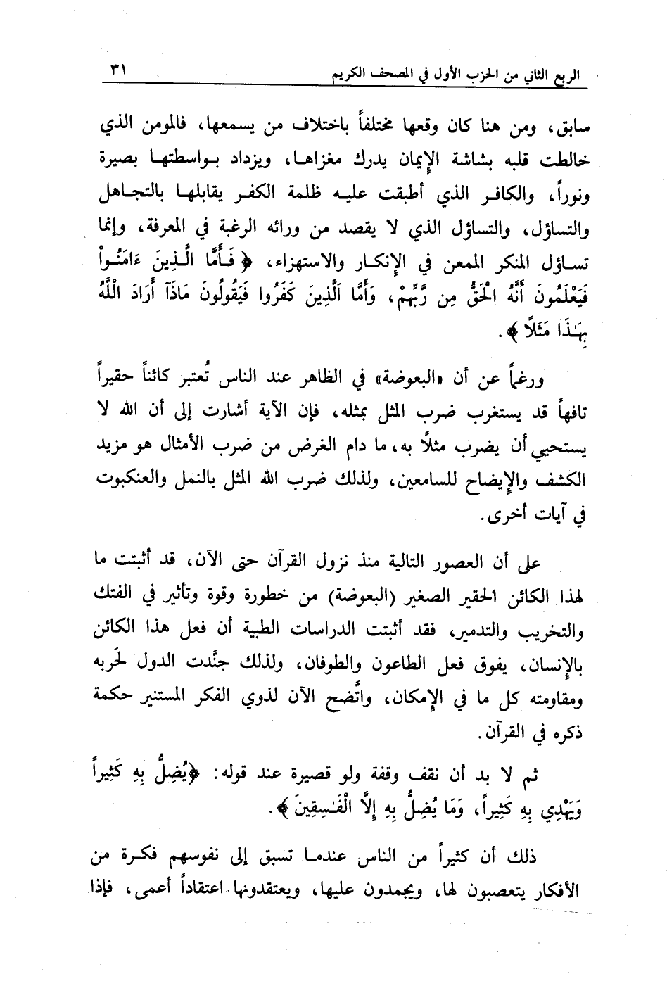سابق، ومن هنا كان وقعها مختلفا باختلاف من يسمعها، فالمؤمن الذي خالطت قلبه بشاشة الإيمان يدرك مغزاها، ويزداد بواسطتها بصيرة ونورا، والكافر الذي أطبقت عليه ظلمة الكفر يقابلها بالتجاهل والتساؤل، والتساؤل الذي لا يقصد من ورائه الرغبة في المعرفة، وإنما تساؤل المنكر الممعن في الإنكار والاستهزاء، {فَأَمَّا الَّذِينَ آمَنُوا فَيَعْلَمُونَ أَنَّهُ الْحَقُّ مِنْ رَبِّهِمْ وَأَمَّا الَّذِينَ كَفَرُوا فَيَقُولُونَ مَاذَا أَرَادَ اللَّهُ بِهَذَا مَثَلًا}.
