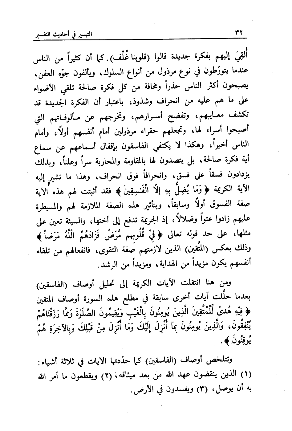 وتتلخص أوصاف (الفاسقين) كما حددتها الآيات في ثلاثة أشياء: (1) الذين ينقضون عهد الله من بعد ميثاقه، (2) ويقطعون ما أمر الله به أن يوصل، (3) ويفسدون في الأرض.