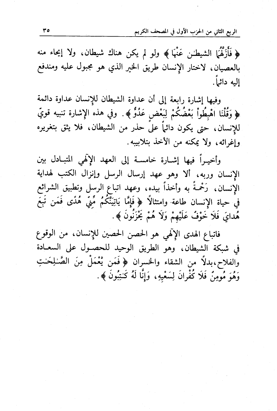 وفيها إشارة رابعة إلى أن عداوة الشيطان للإنسان عداوة دائمة {وَقُلْنَا اهْبِطُوا بَعْضُكُمْ لِبَعْضٍ عَدُوٌّ}. وفي هذه الإشارة تنبيه قوي للإنسان، حتى يكون دائما على حذر من الشيطان، فلا يثق بتغريره وإغرائه، ولا يمكنه من الأخذ بتلابيبه.