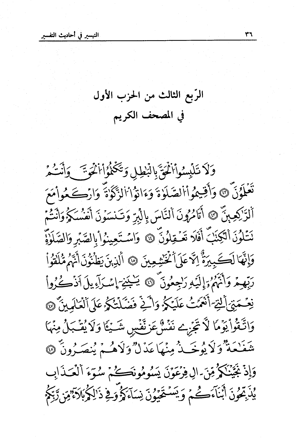 وَلَا تَلْبِسُوا الْحَقَّ بِالْبَاطِلِ وَتَكْتُمُوا الْحَقَّ وَأَنْتُمْ تَعْلَمُونَ (42) وَأَقِيمُوا الصَّلَاةَ وَآتُوا الزَّكَاةَ وَارْكَعُوا مَعَ الرَّاكِعِينَ (43) أَتَأْمُرُونَ النَّاسَ بِالْبِرِّ وَتَنْسَوْنَ أَنْفُسَكُمْ وَأَنْتُمْ تَتْلُونَ الْكِتَابَ أَفَلَا تَعْقِلُونَ (44) وَاسْتَعِينُوا بِالصَّبْرِ وَالصَّلَاةِ وَإِنَّهَا لَكَبِيرَةٌ إِلَّا عَلَى الْخَاشِعِينَ (45) الَّذِينَ يَظُنُّونَ أَنَّهُمْ مُلَاقُو رَبِّهِمْ وَأَنَّهُمْ إِلَيْهِ رَاجِعُونَ (46) يَا بَنِي إِسْرَائِيلَ اذْكُرُوا نِعْمَتِيَ الَّتِي أَنْعَمْتُ عَلَيْكُمْ وَأَنِّي فَضَّلْتُكُمْ عَلَى الْعَالَمِينَ (47) وَاتَّقُوا يَوْمًا لَا تَجْزِي نَفْسٌ عَنْ نَفْسٍ شَيْئًا وَلَا يُقْبَلُ مِنْهَا شَفَاعَةٌ وَلَا يُؤْخَذُ مِنْهَا عَدْلٌ وَلَا هُمْ يُنْصَرُونَ (48) وَإِذْ نَجَّيْنَاكُمْ مِنْ آلِ فِرْعَوْنَ يَسُومُونَكُمْ سُوءَ الْعَذَابِ يُذَبِّحُونَ أَبْنَاءَكُمْ وَيَسْتَحْيُونَ نِسَاءَكُمْ وَفِي ذَلِكُمْ بَلَاءٌ مِنْ رَبِّكُمْ