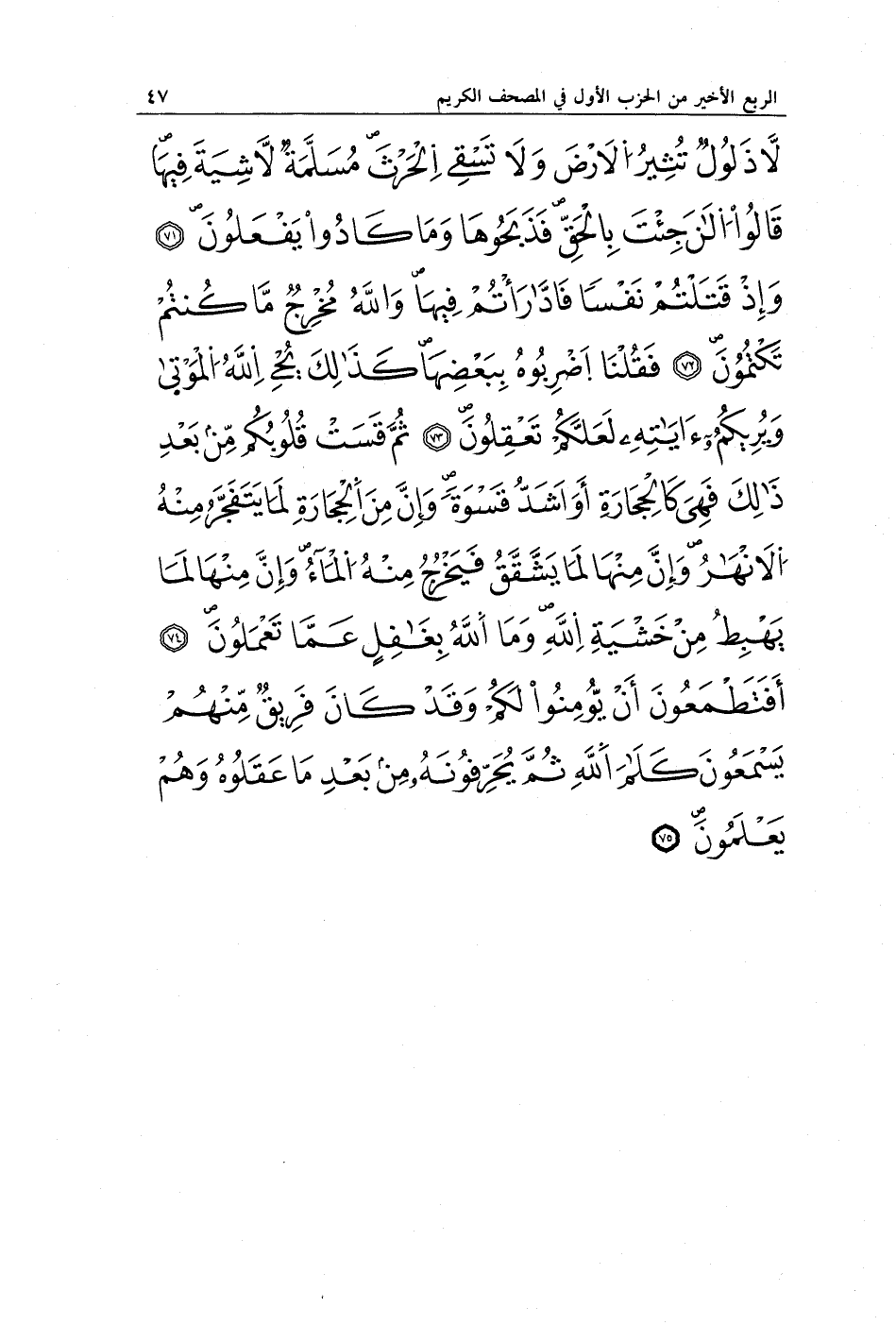 لَا ذَلُولٌ تُثِيرُ الْأَرْضَ وَلَا تَسْقِي الْحَرْثَ مُسَلَّمَةٌ لَا شِيَةَ فِيهَا قَالُوا الْآنَ جِئْتَ بِالْحَقِّ فَذَبَحُوهَا وَمَا كَادُوا يَفْعَلُونَ (71) وَإِذْ قَتَلْتُمْ نَفْسًا فَادَّارَأْتُمْ فِيهَا وَاللَّهُ مُخْرِجٌ مَا كُنْتُمْ تَكْتُمُونَ (72) فَقُلْنَا اضْرِبُوهُ بِبَعْضِهَا كَذَلِكَ يُحْيِ اللَّهُ الْمَوْتَى وَيُرِيكُمْ آيَاتِهِ لَعَلَّكُمْ تَعْقِلُونَ (73) ثُمَّ قَسَتْ قُلُوبُكُمْ مِنْ بَعْدِ ذَلِكَ فَهِيَ كَالْحِجَارَةِ أَوْ أَشَدُّ قَسْوَةً وَإِنَّ مِنَ الْحِجَارَةِ لَمَا يَتَفَجَّرُ مِنْهُ الْأَنْهَارُ وَإِنَّ مِنْهَا لَمَا يَشَّقَّقُ فَيَخْرُجُ مِنْهُ الْمَاءُ وَإِنَّ مِنْهَا لَمَا يَهْبِطُ مِنْ خَشْيَةِ اللَّهِ وَمَا اللَّهُ بِغَافِلٍ عَمَّا تَعْمَلُونَ (74) أَفَتَطْمَعُونَ أَنْ يُؤْمِنُوا لَكُمْ وَقَدْ كَانَ فَرِيقٌ مِنْهُمْ يَسْمَعُونَ كَلَامَ اللَّهِ ثُمَّ يُحَرِّفُونَهُ مِنْ بَعْدِ مَا عَقَلُوهُ وَهُمْ يَعْلَمُونَ (75)