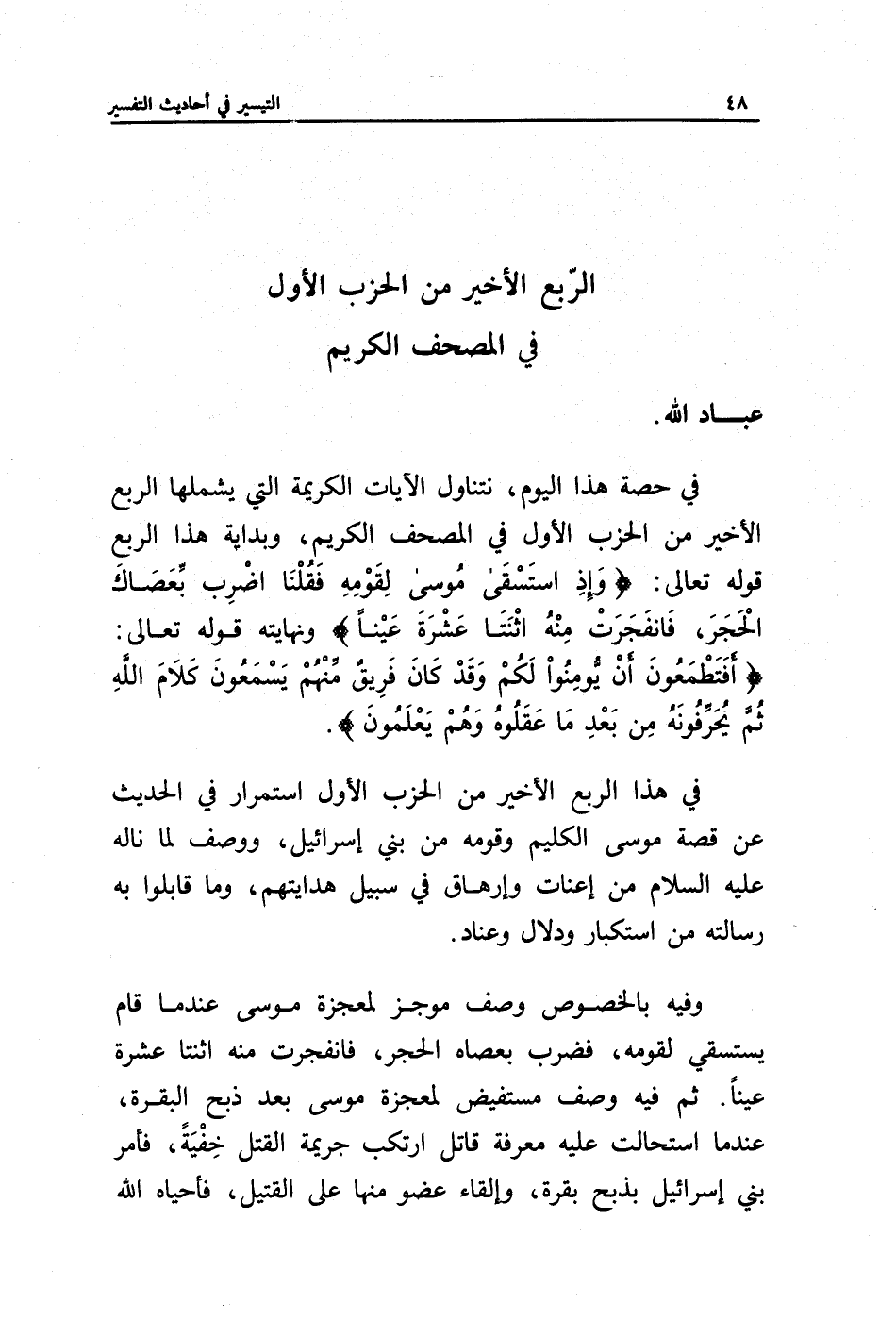 في حصة هذا اليوم، نتناول الآيات الكريمة التي يشملها الربع الأخير من الحزب الأول في المصحف الكريم، لبداية هذا الربع قوله تعالى: {وَإِذِ اسْتَسْقَى مُوسَى لِقَوْمِهِ فَقُلْنَا اضْرِبْ بِعَصَاكَ الْحَجَرَ فَانْفَجَرَتْ مِنْهُ اثْنَتَا عَشْرَةَ عَيْنًا} ونهايته قوله تعالى: {أَفَتَطْمَعُونَ أَنْ يُؤْمِنُوا لَكُمْ وَقَدْ كَانَ فَرِيقٌ مِنْهُمْ يَسْمَعُونَ كَلَامَ اللَّهِ ثُمَّ يُحَرِّفُونَهُ مِنْ بَعْدِ مَا عَقَلُوهُ وَهُمْ يَعْلَمُونَ}