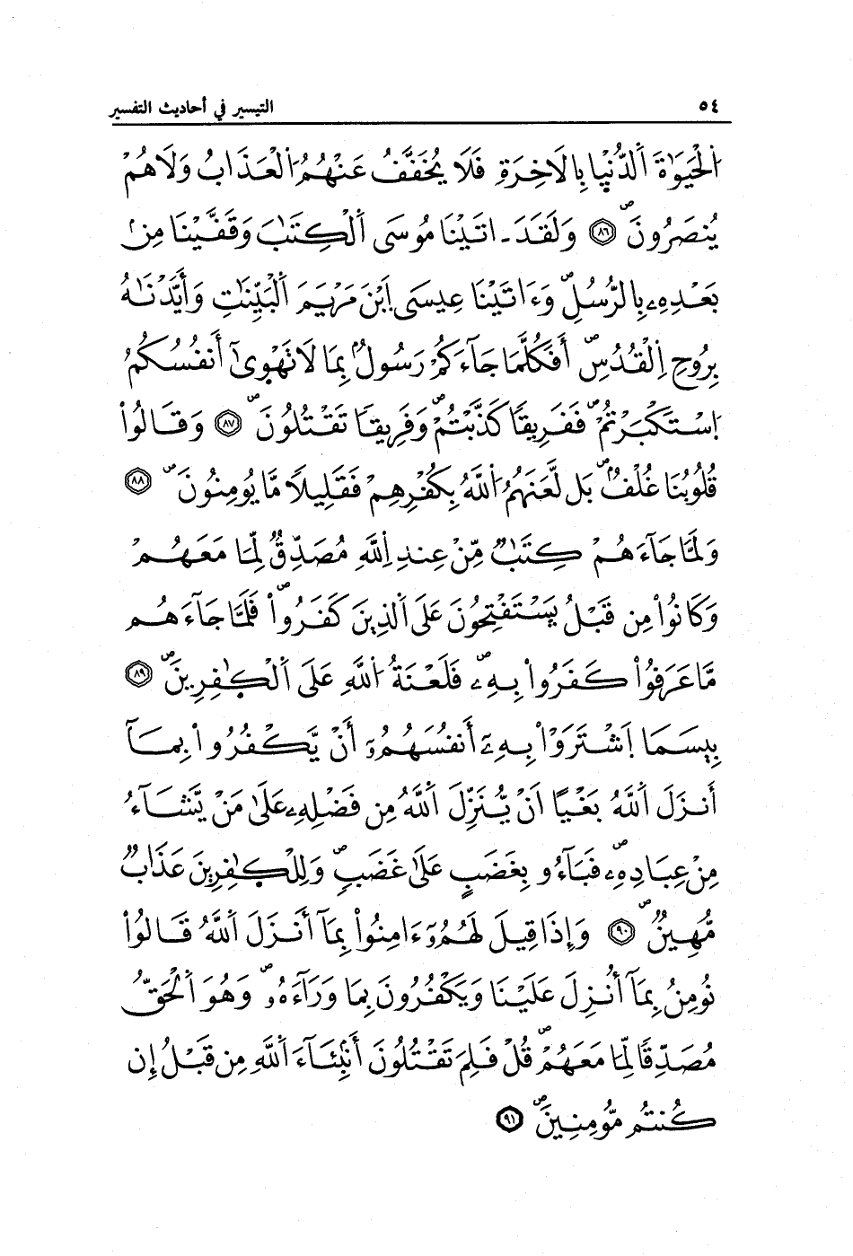 الْحَيَاةَ الدُّنْيَا بِالْآخِرَةِ فَلَا يُخَفَّفُ عَنْهُمُ الْعَذَابُ وَلَا هُمْ يُنْصَرُونَ (86) وَلَقَدْ آتَيْنَا مُوسَى الْكِتَابَ وَقَفَّيْنَا مِنْ بَعْدِهِ بِالرُّسُلِ وَآتَيْنَا عِيسَى ابْنَ مَرْيَمَ الْبَيِّنَاتِ وَأَيَّدْنَاهُ بِرُوحِ الْقُدُسِ أَفَكُلَّمَا جَاءَكُمْ رَسُولٌ بِمَا لَا تَهْوَى أَنْفُسُكُمُ اسْتَكْبَرْتُمْ فَفَرِيقًا كَذَّبْتُمْ وَفَرِيقًا تَقْتُلُونَ (87) وَقَالُوا قُلُوبُنَا غُلْفٌ بَلْ لَعَنَهُمُ اللَّهُ بِكُفْرِهِمْ فَقَلِيلًا مَا يُؤْمِنُونَ (88) وَلَمَّا جَاءَهُمْ كِتَابٌ مِنْ عِنْدِ اللَّهِ مُصَدِّقٌ لِمَا مَعَهُمْ وَكَانُوا مِنْ قَبْلُ يَسْتَفْتِحُونَ عَلَى الَّذِينَ كَفَرُوا فَلَمَّا جَاءَهُمْ مَا عَرَفُوا كَفَرُوا بِهِ فَلَعْنَةُ اللَّهِ عَلَى الْكَافِرِينَ (89) بِئْسَمَا اشْتَرَوْا بِهِ أَنْفُسَهُمْ أَنْ يَكْفُرُوا بِمَا أَنْزَلَ اللَّهُ بَغْيًا أَنْ يُنَزِّلَ اللَّهُ مِنْ فَضْلِهِ عَلَى مَنْ يَشَاءُ مِنْ عِبَادِهِ فَبَاءُوا بِغَضَبٍ عَلَى غَضَبٍ وَلِلْكَافِرِينَ عَذَابٌ مُهِينٌ (90) وَإِذَا قِيلَ لَهُمْ آمِنُوا بِمَا أَنْزَلَ اللَّهُ قَالُوا نُؤْمِنُ بِمَا أُنْزِلَ عَلَيْنَا وَيَكْفُرُونَ بِمَا وَرَاءَهُ وَهُوَ الْحَقُّ مُصَدِّقًا لِمَا مَعَهُمْ قُلْ فَلِمَ تَقْتُلُونَ أَنْبِيَاءَ اللَّهِ مِنْ قَبْلُ إِنْ كُنْتُمْ مُؤْمِنِينَ (91)