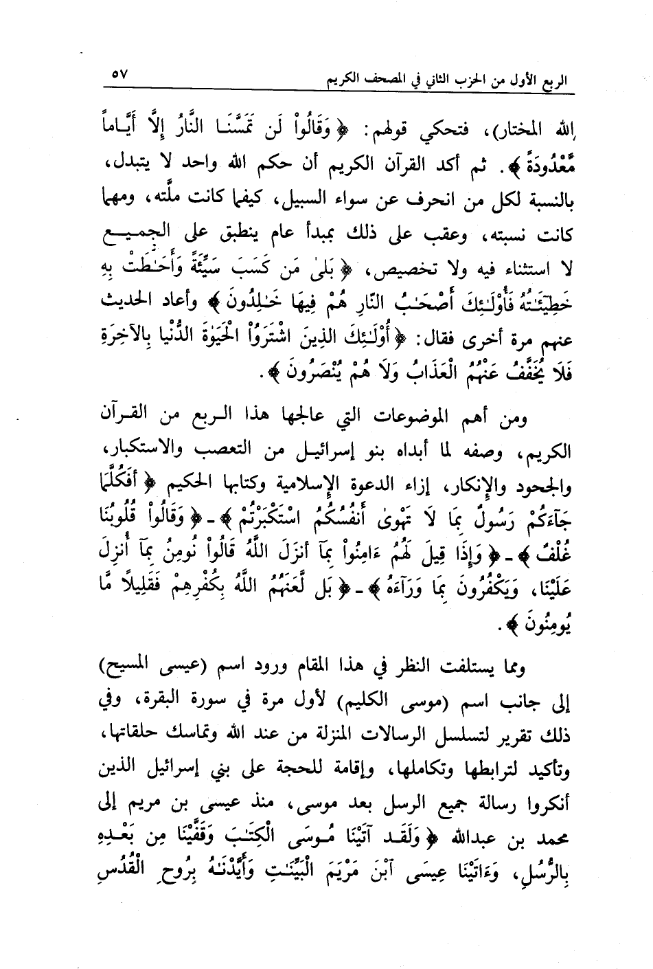 ومن أهم الموضوعات التي عالجها هذا الربع من القرآن الكريم، وصفه لما أبداه بنو إسرائيل من التعصب والاستكبار، والجحود والإنكار، إزاء الدعوة الإسلامية وكتابها الحكيم {أَفَكُلَّمَا جَاءَكُمْ رَسُولٌ بِمَا لَا تَهْوَى أَنْفُسُكُمُ اسْتَكْبَرْتُمْ} - {وَقَالُوا قُلُوبُنَا غُلْفٌ} - {وَإِذَا قِيلَ لَهُمْ آمِنُوا بِمَا أَنْزَلَ اللَّهُ قَالُوا نُؤْمِنُ بِمَا أُنْزِلَ عَلَيْنَا وَيَكْفُرُونَ بِمَا وَرَاءَهُ} - {بَلْ لَعَنَهُمُ اللَّهُ بِكُفْرِهِمْ فَقَلِيلًا مَا يُؤْمِنُونَ}.
