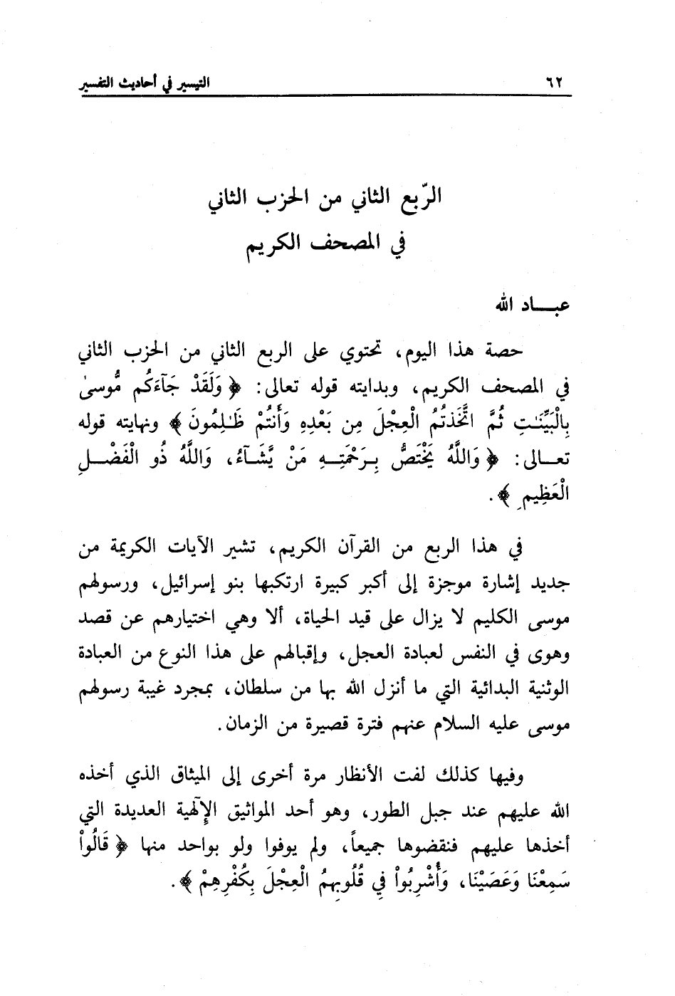 حصة هذا اليوم، تحوي على الربع الثاني من الحزب الثاني في المصحف الكريم، وبدايته قوله تعالى: {وَلَقَدْ جَاءَكُمْ مُوسَى بِالْبَيِّنَاتِ ثُمَّ اتَّخَذْتُمُ الْعِجْلَ مِنْ بَعْدِهِ وَأَنْتُمْ ظَالِمُونَ} ونهايته قوله تعالى: {وَاللَّهُ يَخْتَصُّ بِرَحْمَتِهِ مَنْ يَشَاءُ وَاللَّهُ ذُو الْفَضْلِ الْعَظِيمِ}.