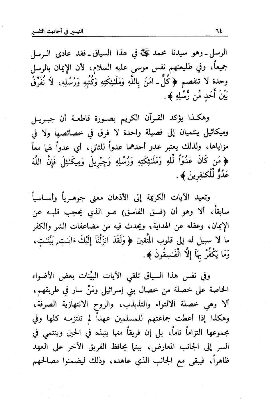 وتعيد الآيات الكريمة إلى الأذهان معنى جوهريا وأساسيا سابقا، ألا وهو أن (فسق الفاسق) هو الذي يحجب قلبه عن الإيمان، وعقله عن الهداية، ويحدث فيه مضاعفات الشر والكفر ما لا سبيل له إلى قلوب المتقين {وَلَقَدْ أَنْزَلْنَا إِلَيْكَ آيَاتٍ بَيِّنَاتٍ وَمَا يَكْفُرُ بِهَا إِلَّا الْفَاسِقُونَ}.