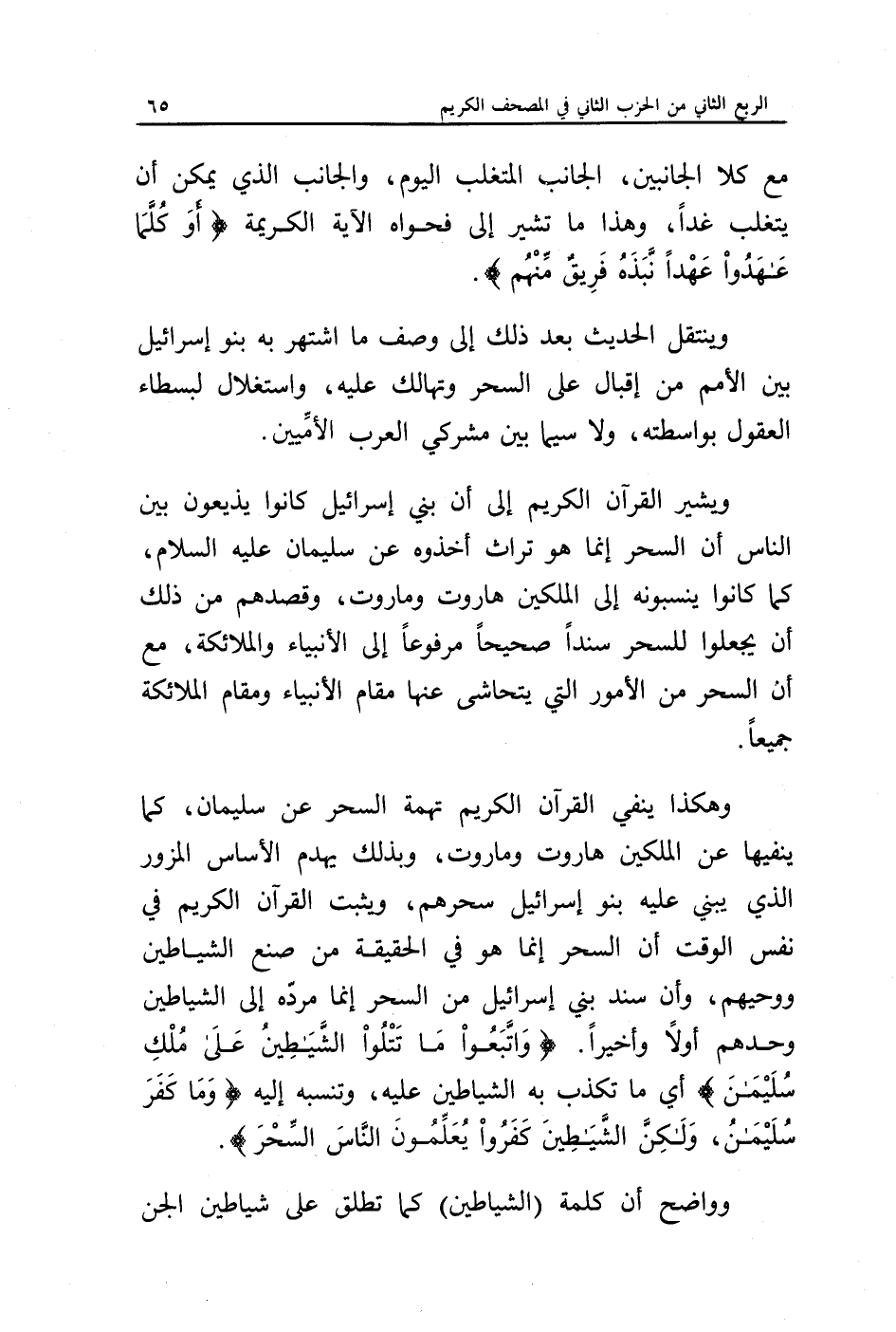 وهكذا ينفي القرآن الكريم تهمة السحر عن سليمان، كما ينفيها عن الملكين هاروت وماروت، وبذلك يهدم الأساس المزور الذي يبني عليه بنو إسرائيل سحرهم، ويثبت القرآن الكريم في نفس الوقت أن السحر إنما هو في الحقيقة من صنع الشياطين ووحيهم، وأن سند بني إسرائيل من السحر إنما مرده إلى الشياطين وحدهم أولا وأخيرا {وَاتَّبَعُوا مَا تَتْلُو الشَّيَاطِينُ عَلَى مُلْكِ سُلَيْمَانَ}. أي ما تكذب به الشياطين عليه، وتنسبه إليه {وَمَا كَفَرَ سُلَيْمَانُ وَلَكِنَّ الشَّيَاطِينَ كَفَرُوا يُعَلِّمُونَ النَّاسَ السِّحْرَ}.
