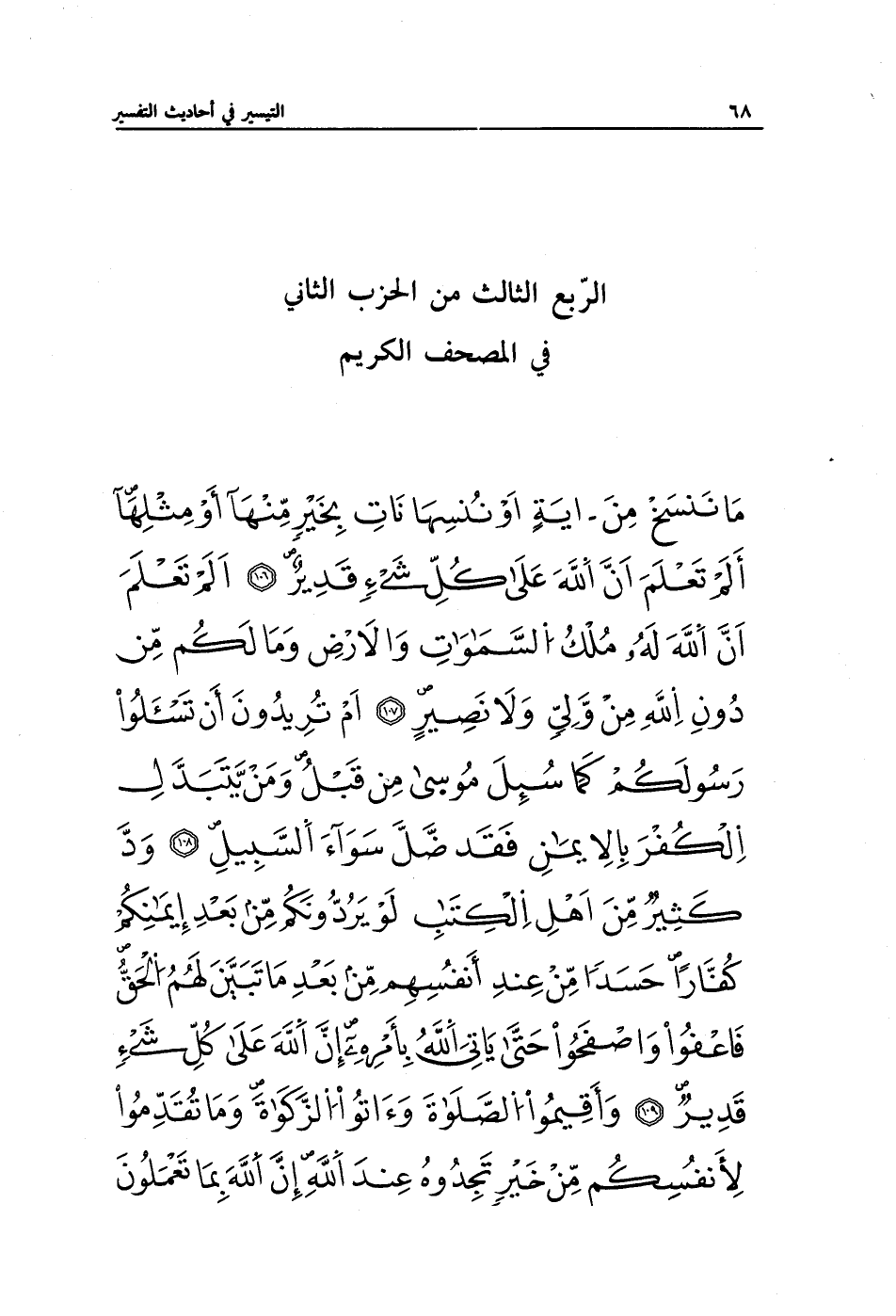 مَا نَنْسَخْ مِنْ آيَةٍ أَوْ نُنْسِهَا نَأْتِ بِخَيْرٍ مِنْهَا أَوْ مِثْلِهَا أَلَمْ تَعْلَمْ أَنَّ اللَّهَ عَلَى كُلِّ شَيْءٍ قَدِيرٌ (106) أَلَمْ تَعْلَمْ أَنَّ اللَّهَ لَهُ مُلْكُ السَّمَاوَاتِ وَالْأَرْضِ وَمَا لَكُمْ مِنْ دُونِ اللَّهِ مِنْ وَلِيٍّ وَلَا نَصِيرٍ (107) أَمْ تُرِيدُونَ أَنْ تَسْأَلُوا رَسُولَكُمْ كَمَا سُئِلَ مُوسَى مِنْ قَبْلُ وَمَنْ يَتَبَدَّلِ الْكُفْرَ بِالْإِيمَانِ فَقَدْ ضَلَّ سَوَاءَ السَّبِيلِ (108) وَدَّ كَثِيرٌ مِنْ أَهْلِ الْكِتَابِ لَوْ يَرُدُّونَكُمْ مِنْ بَعْدِ إِيمَانِكُمْ كُفَّارًا حَسَدًا مِنْ عِنْدِ أَنْفُسِهِمْ مِنْ بَعْدِ مَا تَبَيَّنَ لَهُمُ الْحَقُّ فَاعْفُوا وَاصْفَحُوا حَتَّى يَأْتِيَ اللَّهُ بِأَمْرِهِ إِنَّ اللَّهَ عَلَى كُلِّ شَيْءٍ قَدِيرٌ (109) وَأَقِيمُوا الصَّلَاةَ وَآتُوا الزَّكَاةَ وَمَا تُقَدِّمُوا لِأَنْفُسِكُمْ مِنْ خَيْرٍ تَجِدُوهُ عِنْدَ اللَّهِ إِنَّ اللَّهَ بِمَا تَعْمَلُونَ