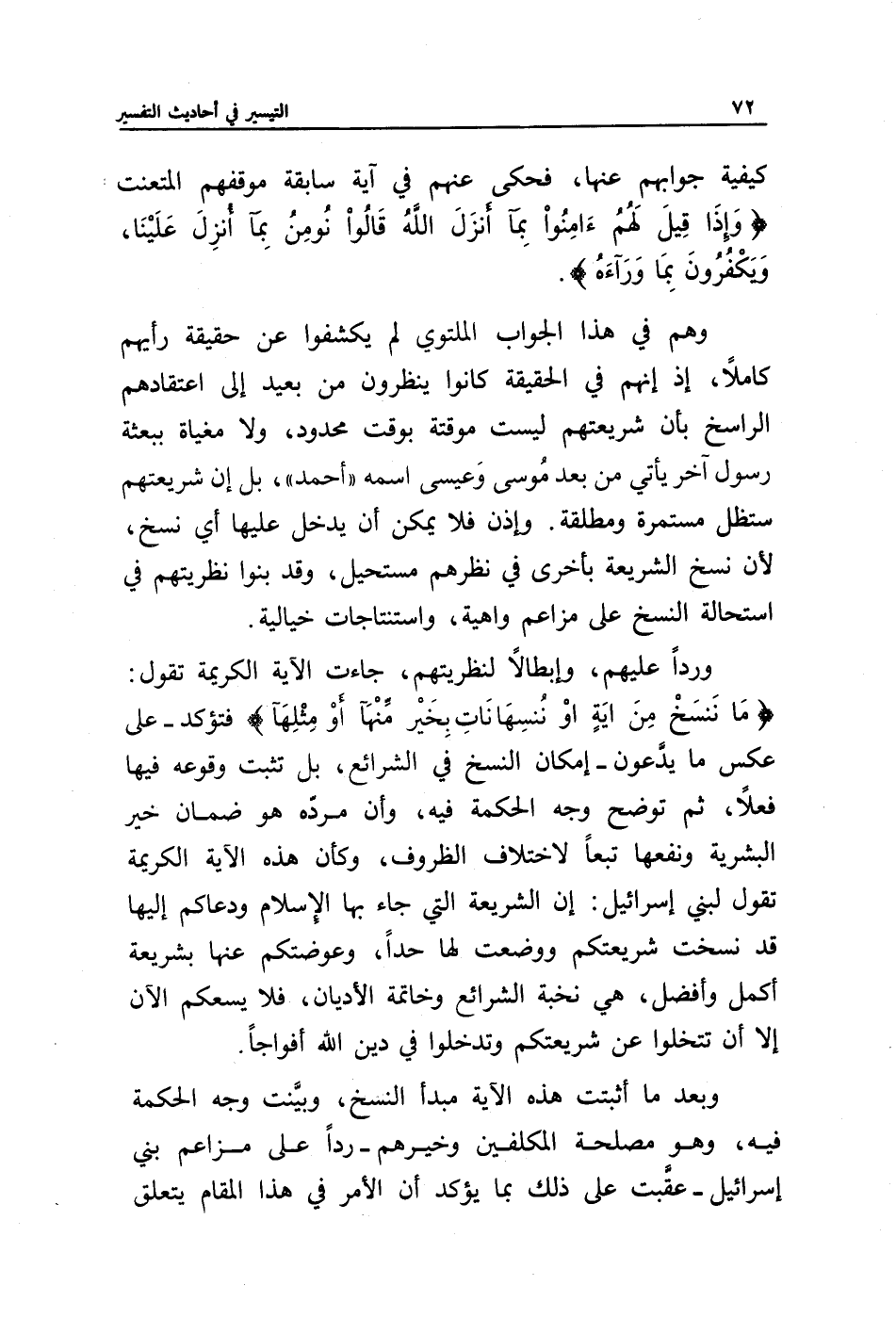 وردا عليهم، وإبطالا لنظريتهم، جاءت الآية الكريمة تقول: {مَا نَنْسَخْ مِنْ آيَةٍ أَوْ نُنْسِهَا نَأْتِ بِخَيْرٍ مِنْهَا أَوْ مِثْلِهَا}. فتؤكد -على عكس ما يدعون- إمكان النسخ في الشرائع، بل تثبت وقوعه فيها فعلا، ثم توضح وجه الحكمة فيه، وأن مرده هو ضمان خير البشرية ونفعها تبعا لاختلاف الظروف، وكأن هذه الآية الكريمة تقول لبني إسرائيل: إن الشريعة التي جاء بها الإسلام ودعاكم إليها قد نسخت شريعتكم ووضعت لها حدا، وعوضتكم عنها بشريعة أكمل وأفضل، وهي نخبة الشرائع وخاتمة الأديان، فلا يسعكم الآن إلا أن تتخلوا عن شريعتكم وتدخلوا في دين الله أفواجا.