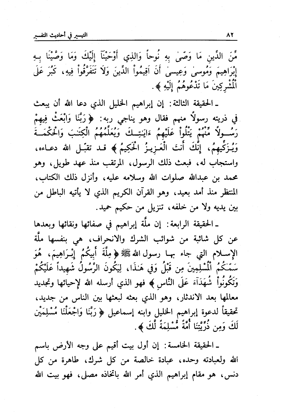 - الحقيقة الرابعة: إن ملة إبراهيم في صفائها ونقائها وبعدها عن كل شائبة من شوائب الشك والانحراف، هي بنفسها ملة الإسلام التي جاء بها رسول الله صلى الله عليه وسلم {مِلَّةَ أَبِيكُمْ إِبْرَاهِيمَ هُوَ سَمَّاكُمُ الْمُسْلِمِينَ مِنْ قَبْلُ وَفِي هَذَا لِيَكُونَ الرَّسُولُ شَهِيدًا عَلَيْكُمْ وَتَكُونُوا شُهَدَاءَ عَلَى النَّاسِ} فهو الذي أرسله الله لإحيائها وتجديد معالمها بعد الاندثار، وهو الذي بعثه لبعثها بين الناس من جديد، تحقيقا لدعوة إبراهيم الخليل وابنه إسماعيل {رَبَّنَا وَاجْعَلْنَا مُسْلِمَيْنِ لَكَ وَمِنْ ذُرِّيَّتِنَا أُمَّةً مُسْلِمَةً لَكَ}.