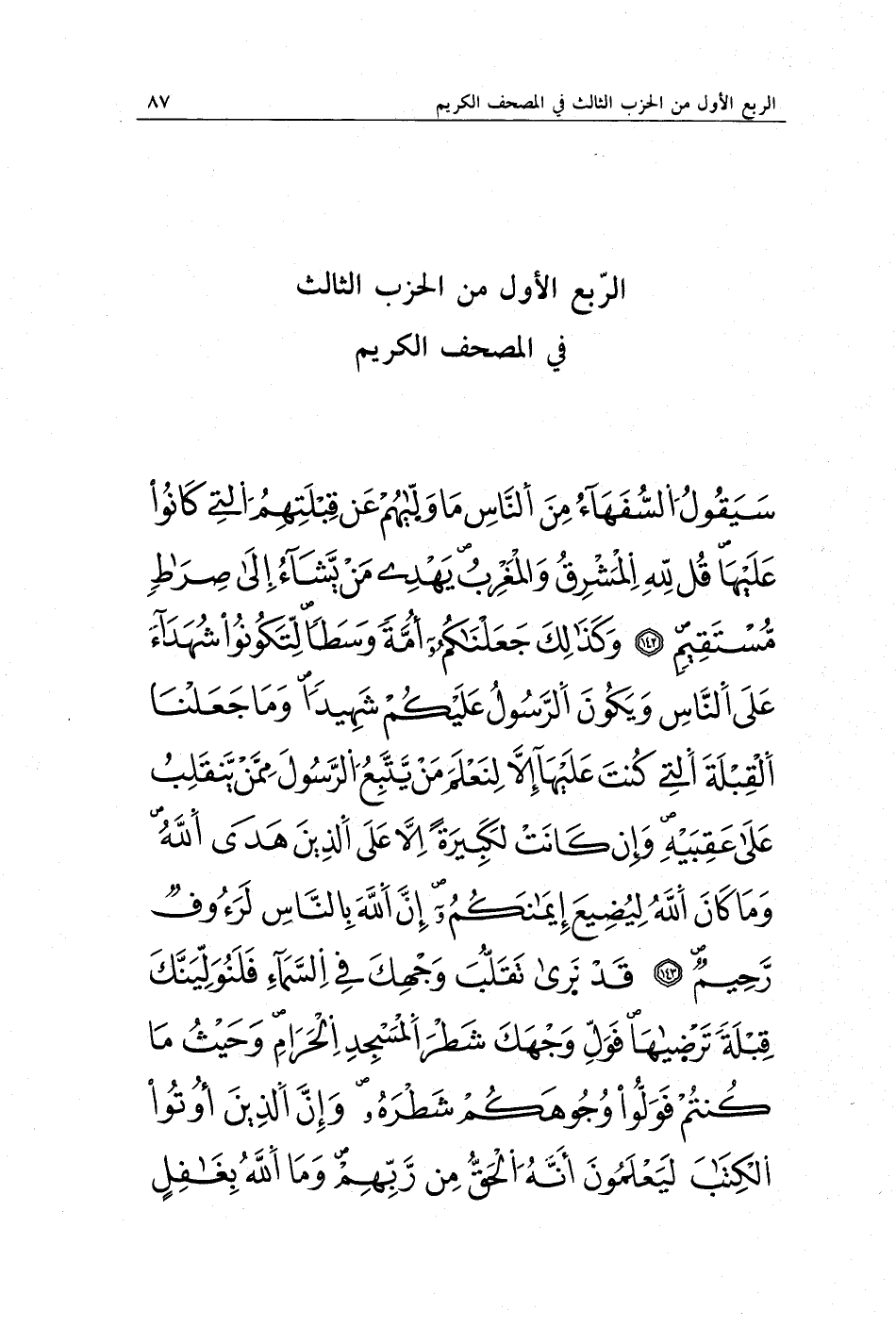 سَيَقُولُ السُّفَهَاءُ مِنَ النَّاسِ مَا وَلَّاهُمْ عَنْ قِبْلَتِهِمُ الَّتِي كَانُوا عَلَيْهَا قُلْ لِلَّهِ الْمَشْرِقُ وَالْمَغْرِبُ يَهْدِي مَنْ يَشَاءُ إِلَى صِرَاطٍ مُسْتَقِيمٍ (142) وَكَذَلِكَ جَعَلْنَاكُمْ أُمَّةً وَسَطًا لِتَكُونُوا شُهَدَاءَ عَلَى النَّاسِ وَيَكُونَ الرَّسُولُ عَلَيْكُمْ شَهِيدًا وَمَا جَعَلْنَا الْقِبْلَةَ الَّتِي كُنْتَ عَلَيْهَا إِلَّا لِنَعْلَمَ مَنْ يَتَّبِعُ الرَّسُولَ مِمَّنْ يَنْقَلِبُ عَلَى عَقِبَيْهِ وَإِنْ كَانَتْ لَكَبِيرَةً إِلَّا عَلَى الَّذِينَ هَدَى اللَّهُ وَمَا كَانَ اللَّهُ لِيُضِيعَ إِيمَانَكُمْ إِنَّ اللَّهَ بِالنَّاسِ لَرَءُوفٌ رَحِيمٌ (143) قَدْ نَرَى تَقَلُّبَ وَجْهِكَ فِي السَّمَاءِ فَلَنُوَلِّيَنَّكَ قِبْلَةً تَرْضَاهَا فَوَلِّ وَجْهَكَ شَطْرَ الْمَسْجِدِ الْحَرَامِ وَحَيْثُ مَا كُنْتُمْ فَوَلُّوا وُجُوهَكُمْ شَطْرَهُ وَإِنَّ الَّذِينَ أُوتُوا الْكِتَابَ لَيَعْلَمُونَ أَنَّهُ الْحَقُّ مِنْ رَبِّهِمْ وَمَا اللَّهُ بِغَافِلٍ