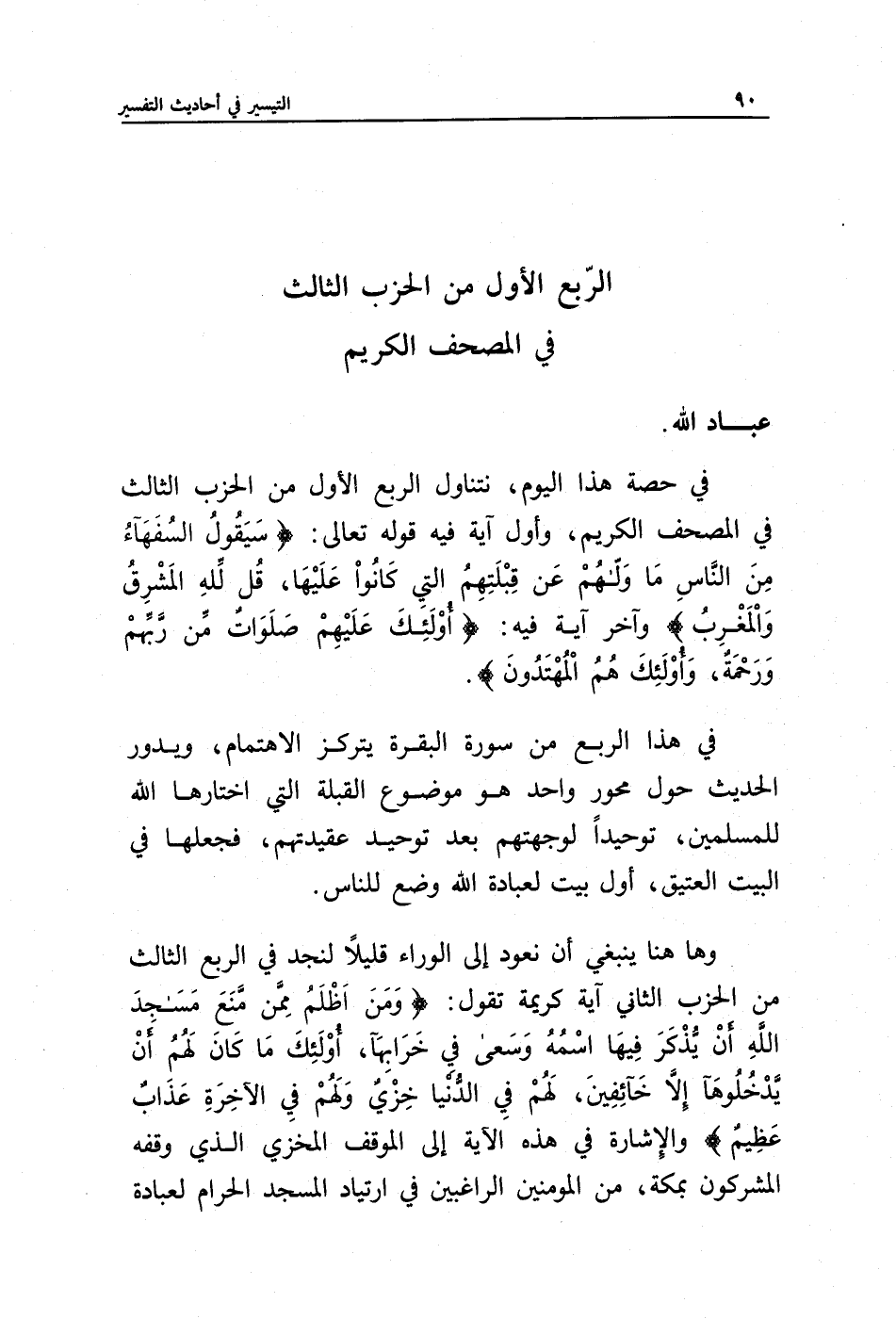 في حصة هذا اليوم، نتناول الربع الأول من الحزب الثالث في المصحف الكريم، وأول آية فيه قوله تعالى: {سَيَقُولُ السُّفَهَاءُ مِنَ النَّاسِ مَا وَلَّاهُمْ عَنْ قِبْلَتِهِمُ الَّتِي كَانُوا عَلَيْهَا قُلْ لِلَّهِ الْمَشْرِقُ وَالْمَغْرِبُ} وآخر آية فيه: {أُولَئِكَ عَلَيْهِمْ صَلَوَاتٌ مِنْ رَبِّهِمْ وَرَحْمَةٌ وَأُولَئِكَ هُمُ الْمُهْتَدُونَ}.