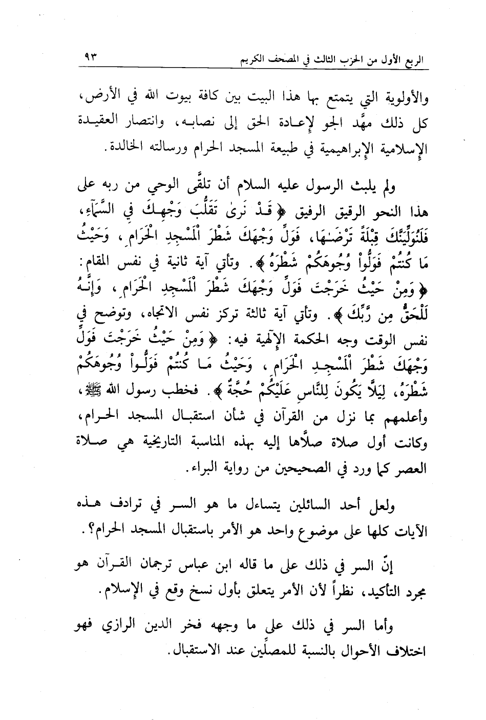 ولعل أحد السائلين يتساءل ما هو السر في ترادف هذه الآيات كلها على موضوع واحد هو الأمر باستقبال المسجد الحرام؟.