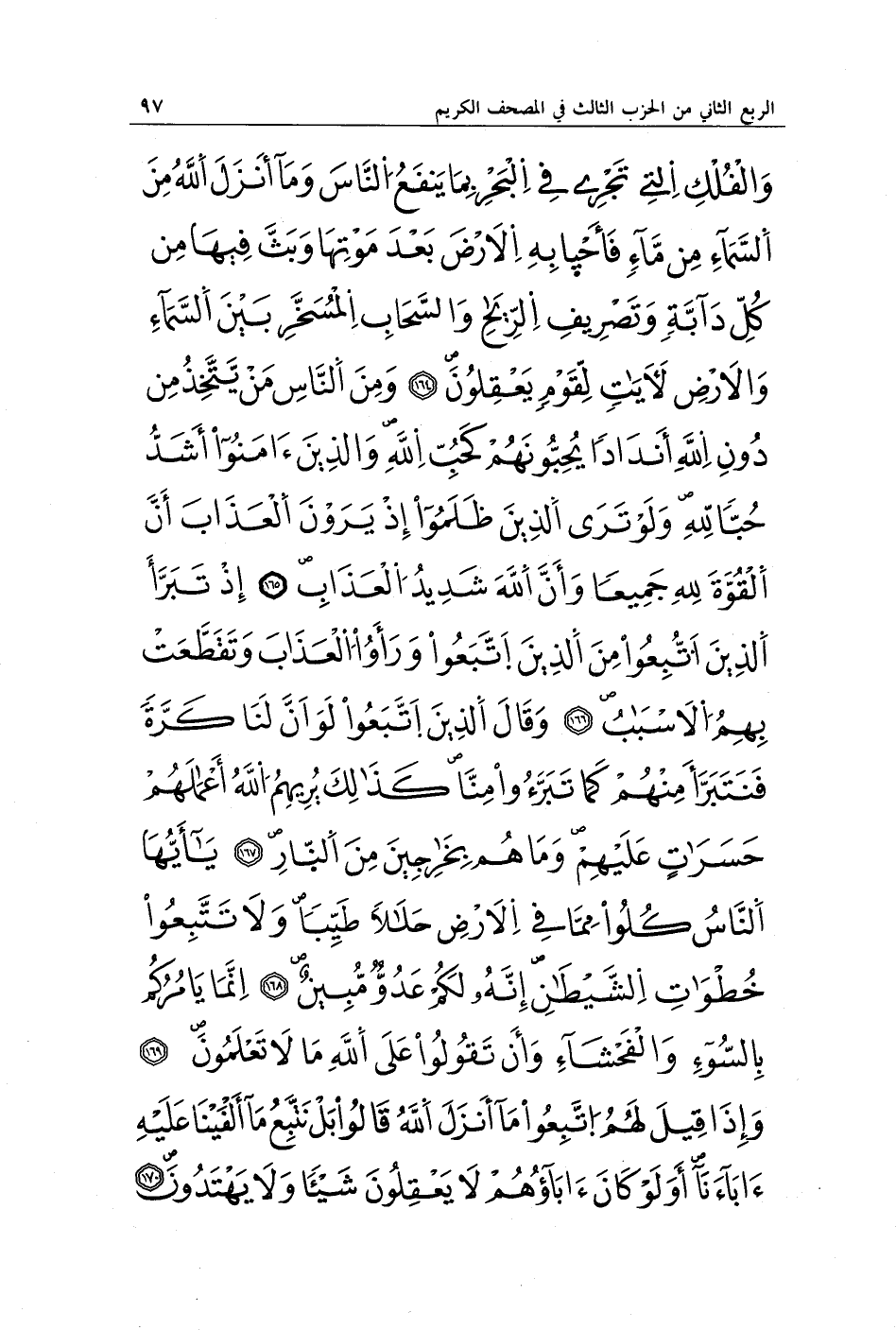 وَالْفُلْكِ الَّتِي تَجْرِي فِي الْبَحْرِ بِمَا يَنْفَعُ النَّاسَ وَمَا أَنْزَلَ اللَّهُ مِنَ السَّمَاءِ مِنْ مَاءٍ فَأَحْيَا بِهِ الْأَرْضَ بَعْدَ مَوْتِهَا وَبَثَّ فِيهَا مِنْ كُلِّ دَابَّةٍ وَتَصْرِيفِ الرِّيَاحِ وَالسَّحَابِ الْمُسَخَّرِ بَيْنَ السَّمَاءِ وَالْأَرْضِ لَآيَاتٍ لِقَوْمٍ يَعْقِلُونَ (164) وَمِنَ النَّاسِ مَنْ يَتَّخِذُ مِنْ دُونِ اللَّهِ أَنْدَادًا يُحِبُّونَهُمْ كَحُبِّ اللَّهِ وَالَّذِينَ آمَنُوا أَشَدُّ حُبًّا لِلَّهِ وَلَوْ يَرَى الَّذِينَ ظَلَمُوا إِذْ يَرَوْنَ الْعَذَابَ أَنَّ الْقُوَّةَ لِلَّهِ جَمِيعًا وَأَنَّ اللَّهَ شَدِيدُ الْعَذَابِ (165) إِذْ تَبَرَّأَ الَّذِينَ اتُّبِعُوا مِنَ الَّذِينَ اتَّبَعُوا وَرَأَوُا الْعَذَابَ وَتَقَطَّعَتْ بِهِمُ الْأَسْبَابُ (166) وَقَالَ الَّذِينَ اتَّبَعُوا لَوْ أَنَّ لَنَا كَرَّةً فَنَتَبَرَّأَ مِنْهُمْ كَمَا تَبَرَّءُوا مِنَّا كَذَلِكَ يُرِيهِمُ اللَّهُ أَعْمَالَهُمْ حَسَرَاتٍ عَلَيْهِمْ وَمَا هُمْ بِخَارِجِينَ مِنَ النَّارِ (167) يَا أَيُّهَا النَّاسُ كُلُوا مِمَّا فِي الْأَرْضِ حَلَالًا طَيِّبًا وَلَا تَتَّبِعُوا خُطُوَاتِ الشَّيْطَانِ إِنَّهُ لَكُمْ عَدُوٌّ مُبِينٌ (168) إِنَّمَا يَأْمُرُكُمْ بِالسُّوءِ وَالْفَحْشَاءِ وَأَنْ تَقُولُوا عَلَى اللَّهِ مَا لَا تَعْلَمُونَ (169) وَإِذَا قِيلَ لَهُمُ اتَّبِعُوا مَا أَنْزَلَ اللَّهُ قَالُوا بَلْ نَتَّبِعُ مَا أَلْفَيْنَا عَلَيْهِ آبَاءَنَا أَوَلَوْ كَانَ آبَاؤُهُمْ لَا يَعْقِلُونَ شَيْئًا وَلَا يَهْتَدُونَ (170)