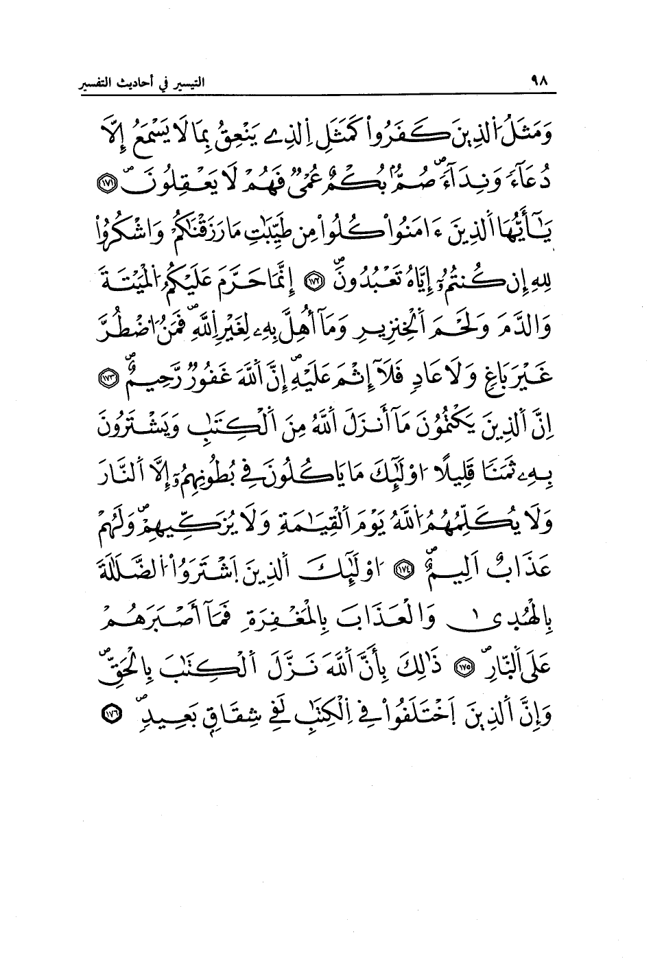 وَمَثَلُ الَّذِينَ كَفَرُوا كَمَثَلِ الَّذِي يَنْعِقُ بِمَا لَا يَسْمَعُ إِلَّا دُعَاءً وَنِدَاءً صُمٌّ بُكْمٌ عُمْيٌ فَهُمْ لَا يَعْقِلُونَ (171) يَا أَيُّهَا الَّذِينَ آمَنُوا كُلُوا مِنْ طَيِّبَاتِ مَا رَزَقْنَاكُمْ وَاشْكُرُوا لِلَّهِ إِنْ كُنْتُمْ إِيَّاهُ تَعْبُدُونَ (172) إِنَّمَا حَرَّمَ عَلَيْكُمُ الْمَيْتَةَ وَالدَّمَ وَلَحْمَ الْخِنْزِيرِ وَمَا أُهِلَّ بِهِ لِغَيْرِ اللَّهِ فَمَنِ اضْطُرَّ غَيْرَ بَاغٍ وَلَا عَادٍ فَلَا إِثْمَ عَلَيْهِ إِنَّ اللَّهَ غَفُورٌ رَحِيمٌ (173) إِنَّ الَّذِينَ يَكْتُمُونَ مَا أَنْزَلَ اللَّهُ مِنَ الْكِتَابِ وَيَشْتَرُونَ بِهِ ثَمَنًا قَلِيلًا أُولَئِكَ مَا يَأْكُلُونَ فِي بُطُونِهِمْ إِلَّا النَّارَ وَلَا يُكَلِّمُهُمُ اللَّهُ يَوْمَ الْقِيَامَةِ وَلَا يُزَكِّيهِمْ وَلَهُمْ عَذَابٌ أَلِيمٌ (174) أُولَئِكَ الَّذِينَ اشْتَرَوُا الضَّلَالَةَ بِالْهُدَى وَالْعَذَابَ بِالْمَغْفِرَةِ فَمَا أَصْبَرَهُمْ عَلَى النَّارِ (175) ذَلِكَ بِأَنَّ اللَّهَ نَزَّلَ الْكِتَابَ بِالْحَقِّ وَإِنَّ الَّذِينَ اخْتَلَفُوا فِي الْكِتَابِ لَفِي شِقَاقٍ بَعِيدٍ (176)