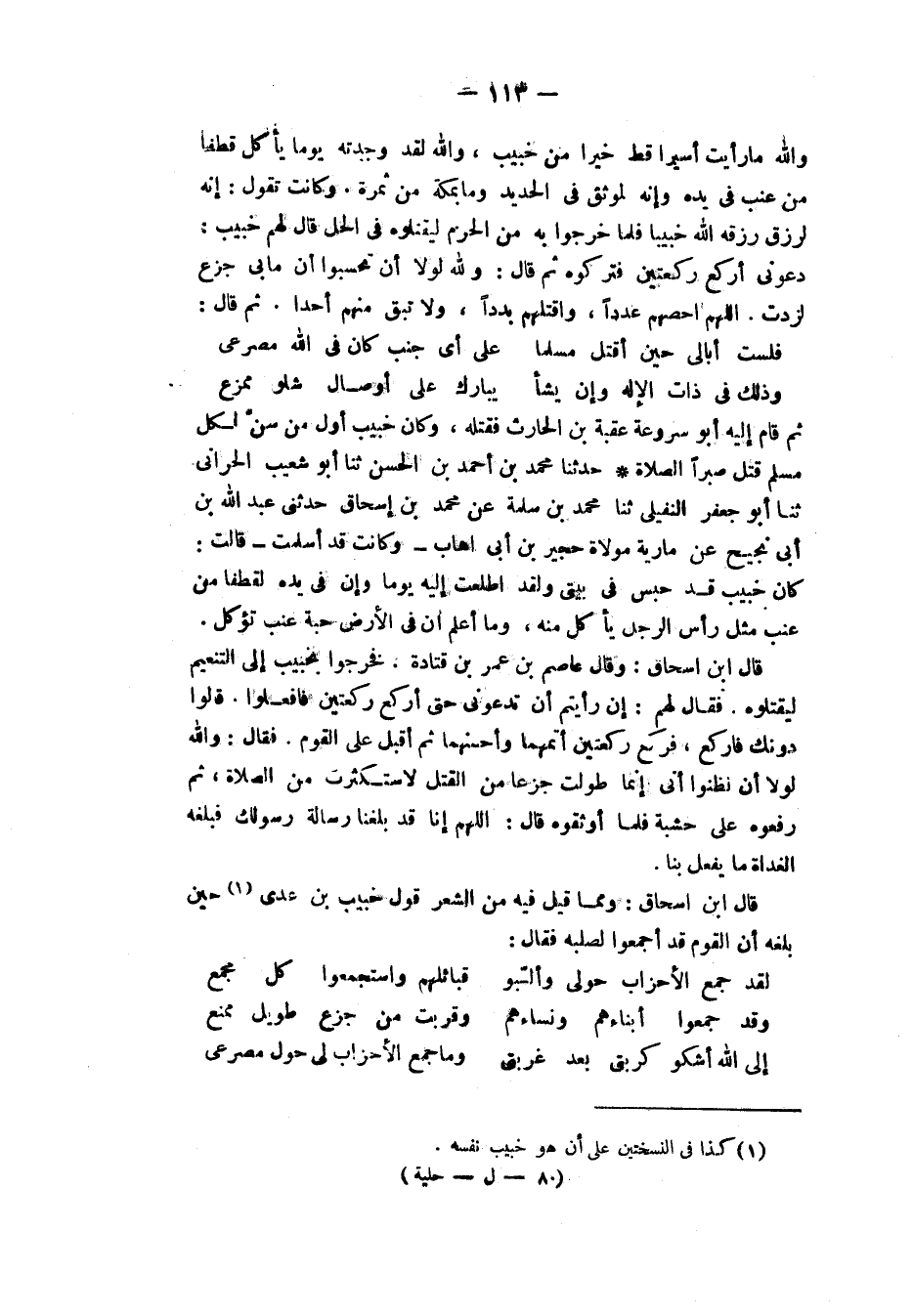 حَدَّثَنَا مُحَمَّدُ بْنُ أَحْمَدَ بْنِ الْحَسَنِ، ثنا أَبُو شُعَيْبٍ الْحَرَّانِيُّ، ثنا أَبُو جَعْفَرٍ النُّفَيْلِيُّ، ثنا مُحَمَّدُ بْنُ سَلَمَةَ، عَنْ مُحَمَّدِ بْنِ إِسْحَاقَ، حَدَّثَنِي عَبْدُ اللهِ بْنُ أَبِي نَجِيحٍ، عَنْ مَارِيَةَ، مَوْلَاةِ حُجَيْرِ بْنِ أَبِي أَهَابٍ، وَكَانَتْ قَدْ أَسْلَمَتْ، قَالَتْ: " كَانَ خُبَيْبٌ قَدْ حُبِسَ فِي بَيْتِي، وَلَقَدِ اطَّلَعْتُ إِلَيْهِ يَوْمًا وَإِنَّ فِي يَدِهِ لَقِطْفًا مِنْ عِنَبٍ مِثْلَ رَأْسِ الرَّجُلِ يَأْكُلُ مِنْهُ، وَمَا أَعْلَمُ أَنَّ فِي الْأَرْضِ حَبَّةَ عِنَبٍ تُؤْكَلُ. قَالَ ابْنُ إِسْحَاقَ: وَقَالَ عَاصِمُ بْنُ عُمَرَ بْنِ قَتَادَةَ: فَخَرَجُوا بِخُبَيْبٍ إِلَى التَّنْعِيمِ لِيَقْتُلُوهُ، فَقَالَ لَهُمْ: «إِنْ رَأَيْتُمْ أَنْ تَدَعُونِي حَتَّى أَرْكَعَ رَكْعَتَيْنِ فَافْعَلُوا»، قَالُوا: دُونَكَ فَارْكَعْ، فَرَكَعَ رَكْعَتَيْنِ أَتَمَّهُمَا وَأَحْسَنَهُمَا، ثُمَّ أَقْبَلَ عَلَى الْقَوْمِ فَقَالَ: «وَاللهِ لَوْلَا أَنْ تَظُنُّوا أَنِّي إِنَّمَا طَوَّلْتُ جَزَعًا مِنَ الْقَتْلِ لَاسْتَكْثَرْتُ مِنَ الصَّلَاةِ» ثُمَّ رَفَعُوهُ عَلَى خَشَبَةٍ، فَلَمَّا أَوْثَقُوهُ قَالَ: «§اللهُمَّ إِنَّا قَدْ بَلَّغْنَا رِسَالَةَ رَسُولِكَ، فَبَلِّغْهُ الْغَدَاةَ مَا يُفْعَلُ بِنَا» قَالَ ابْنُ إِسْحَاقَ: وَمِمَّا قِيلَ فِيهِ مِنَ الشَّعْرِ قَوْلُ خُبَيْبِ بْنِ عَدِيٍّ حِينَ بَلَغَهُ أَنَّ الْقَوْمَ قَدْ أَجْمَعُوا لِصَلْبِهِ، فَقَالَ: