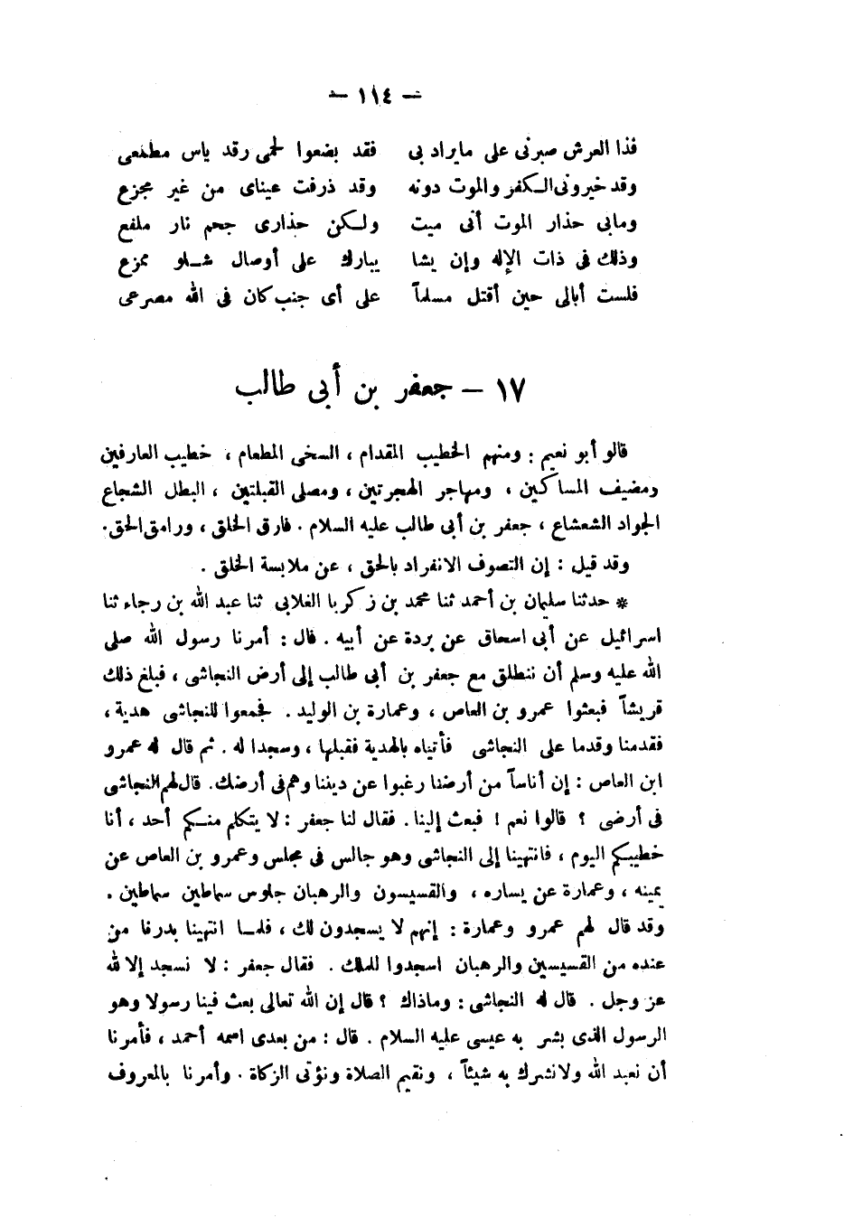 §جَعْفَرُ بْنُ أَبِي طَالِبٍ قَالَ أَبُو نُعَيْمٍ: وَمِنْهُمُ الْخَطِيبُ الْمِقْدَامُ، السَّخِيُّ الْمِطْعَامُ، خَطِيبُ الْعَارِفِينَ، وَمُضِيفُ الْمَسَاكِينِ، وَمُهَاجِرُ الْهِجْرَتَيْنِ، وَمُصَلِّي الْقِبْلَتَيْنِ، الْبَطَلُ الشُّجَاعُ، الْجَوَادُ الشَّعْشَاعُ جَعْفَرُ بْنُ أَبِي طَالِبٍ عَلَيْهِ السَّلَامُ. فَارِقُ الْخَلْقِ، وَرَامِقُ الْحَقِّ وَقَدْ قِيلَ: «إِنَّ التَّصَوُّفَ الِانْفِرَادُ بِالْحَقِّ، عَنْ مُلَابَسَةِ الْخَلْقِ»