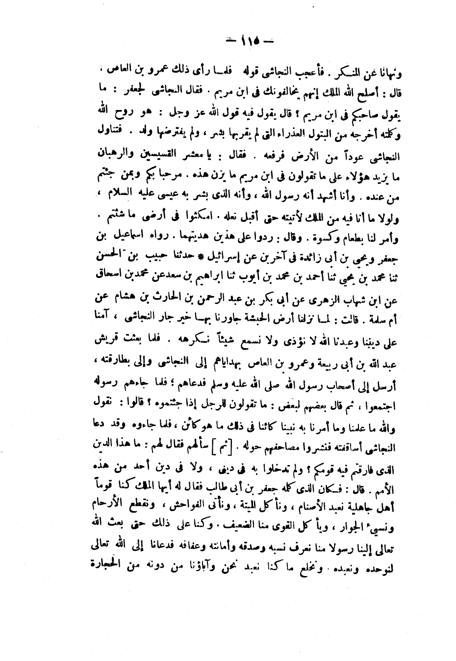 حَدَّثَنَا حَبِيبُ بْنُ الْحَسَنِ، ثَنَا مُحَمَّدُ بْنُ يَحْيَى، ثَنَا أَحْمَدُ بْنُ مُحَمَّدِ بْنِ أَيُّوبَ، ثَنَا إِبْرَاهِيمُ بْنُ سَعْدٍ، عَنْ مُحَمَّدِ بْنِ إِسْحَاقَ، عَنِ ابْنِ شِهَابٍ الزُّهْرِيِّ، عَنْ أَبِي بَكْرِ بْنِ عَبْدِ الرَّحْمَنِ بْنِ الْحَارِثِ بْنِ هِشَامٍ، عَنْ أُمِّ سَلَمَةَ، قَالَتْ: لَمَّا نَزَلْنَا أَرْضَ الْحَبَشَةِ جَاوَرْنَا بِهَا خَيْرَ جَارٍ النَّجَاشِيَّ، آمَنَّا عَلَى دِينِنَا، وَعَبَدْنَا اللهَ لَا نُؤْذَى وَلَا نَسْمَعُ شَيْئًا نَكْرَهُهُ، فَلَمَّا بَعَثَتْ قُرَيْشٌ عَبْدَ اللهِ بْنَ أَبِي رَبِيعَةَ وَعَمْرَو بْنَ الْعَاصِ بِهَدَايَاهُمْ إِلَى النَّجَاشِيِّ وَإِلَى بَطَارِقَتِهِ، أَرْسَلَ إِلَى أَصْحَابِ رَسُولِ اللهِ صَلَّى اللهُ عَلَيْهِ وَسَلَّمَ فَدَعَاهُمْ، فَلَمَّا جَاءَهُمْ رَسُولُهُ اجْتَمَعُوا ثُمَّ قَالَ بَعْضُهُمْ لِبَعْضٍ: مَا تَقُولُونَ لِلرَّجُلِ إِذَا جِئْتُمُوهُ؟ قَالُوا: نَقُولُ وَاللهِ مَا عَلِمْنَا، وَمَا أَمَرَنَا بِهِ نَبِيُّنَا كَائِنًا فِي ذَلِكَ مَا هُوَ كَائِنٌ، فَلَمَّا جَاءُوهُ، وَقَدْ دَعَا النَّجَاشِيُّ أَسَاقِفَتَهُ فَنَشَرُوا مَصَاحِفَهُمْ حَوْلَهُ، ثُمَّ سَأَلَهُمْ فَقَالَ لَهُمْ: مَا هَذَا الدِّينُ الَّذِي فَارَقْتُمْ فِيهِ قَوْمَكُمْ، وَلَمْ تَدْخُلُوا بِهِ فِي دِينِي وَلَا فِي دِينِ أَحَدٍ مِنْ هَذِهِ الْأُمَمِ؟ قَالَ: فَكَانَ الَّذِي كَلَّمَهُ جَعْفَرُ بْنُ أَبِي طَالِبٍ فَقَالَ لَهُ: أَيُّهَا الْمَلِكُ كُنَّا قَوْمًا أَهْلَ جَاهِلِيَّةٍ، نَعْبُدُ الْأَصْنَامَ، وَنَأْكُلُ الْمَيْتَةَ، وَنَأْتِي الْفَوَاحِشَ، وَنَقْطَعُ الْأَرْحَامَ، وَنُسِيئُ الْجِوَارَ، وَيَأْكُلُ الْقَوِيُّ مِنَّا الضَّعِيفَ، وَكُنَّا عَلَى ذَلِكَ حَتَّى بَعَثَ اللهُ تَعَالَى إِلَيْنَا رَسُولًا مِنَّا، نَعْرِفُ نَسَبَهُ وَصِدْقَهُ وَأَمَانَتَهُ وَعَفَافَهُ، فَدَعَانَا إِلَى اللهِ تَعَالَى لِنُوَحِّدَهُ وَنَعْبُدَهُ، وَنَخْلَعَ مَا كُنَّا نَعْبُدُ نَحْنُ وَآبَاؤُنَا مِنْ دُونِهِ مِنَ الْحِجَارَةِ -[116]- وَالْأَوْثَانِ، وَأَمَرَنَا بِصِدْقِ الْحَدِيثِ، وَأَدَاءِ الْأَمَانَةِ، وَصِلَةِ الرَّحِمِ، وَحُسْنِ الْجِوَارِ، وَالْكَفِّ عَنِ الْمَحَارِمِ وَالدِّمَاءِ، وَنَهَانَا عَنِ الْفُحْشِ، وَقَوْلِ الزُّورِ، وَأَكْلِ مَالِ الْيَتِيمِ، وَقَذْفِ الْمُحْصَنَةِ، وَأَمَرَنَا أَنَّ نَعْبُدَ اللهَ وَحْدَهُ وَلَا نُشْرِكُ بِهِ شَيْئًا، وَأَمَرَنَا بِالصَّلَاةِ وَالزَّكَاةِ وَالصِّيَامِ - قَالَ: فَعَدَّدَ عَلَيْهِ أُمُورَ الْإِسْلَامِ - فَصَدَّقْنَاهُ وَآمَنَّا بِهِ وَاتَّبَعْنَاهُ عَلَى مَا جَاءَ بِهِ مِنَ اللهِ عَزَّ وَجَلَّ، فَعَبَدْنَا اللهَ وَحْدَهُ فَلَمْ نُشْرِكْ بِهِ شَيْئًا، وَحَرَّمْنَا مَا حَرَّمَ عَلَيْنَا وَأَحْلَلْنَا مَا أَحَلَّ لَنَا، فَعَدَا عَلَيْنَا قَوْمُنَا فَعَذَّبُونَا وَفَتَنُونَا عَنْ دِينِنَا لِيَرُدُّونَا إِلَى عِبَادَةِ الْأَوْثَانِ مِنْ عِبَادَةِ اللهِ عَزَّ وَجَلَّ، وَأَنْ نَسْتَحِلَّ مَا كُنَّا نَسْتَحِلُّ مِنَ الْخَبَائِثِ، فَلَمَّا قَهَرُونَا وَظَلَمُونَا وَضَيَّقُوا عَلَيْنَا وَحَالُوا بَيْنَنَا وَبَيْنَ دِينِنَا، خَرَجْنَا إِلَى بِلَادِكَ فَاخْتَرْنَاكَ عَلَى مَنْ سِوَاكَ، وَرَغِبْنَا فِي جِوَارِكَ، وَرَجَوْنَا أَنْ لَا نُظْلَمَ عِنْدَكَ أَيُّهَا الْمَلِكُ. فَقَالَ لَهُ النَّجَاشِيُّ: هَلْ مَعَكَ مِمَّا جَاءَ بِهِ عَنِ اللهِ مِنْ شَيْءٍ؟ فَقَالَ لَهُ جَعْفَرٌ: نَعَمْ، فَقَالَ لَهُ: اقْرَأْ عَلَيَّ، فَقَرَأَ عَلَيْهِ صَدْرًا مِنْ كهيعص، فَبَكَى النَّجَاشِيُّ وَاللهِ حَتَّى أَخْضَلَ لِحْيَتَهُ، وَبَكَتْ أَسَاقِفَتُهُ حَتَّى أَخْضَلُوا مَصَاحِفَهُمْ حِينَ سَمِعُوا مَا تُلِيَ عَلَيْه