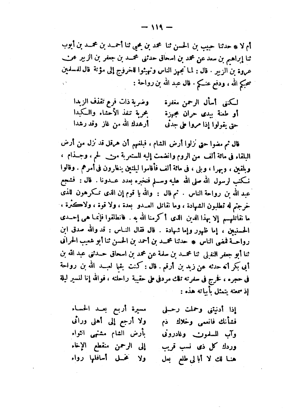 حَدَّثَنَا مُحَمَّدُ بْنُ أَحْمَدَ بْنِ الْحَسَنِ، ثَنَا أَبُو شُعَيْبٍ الْحَرَّانِيُّ، ثَنَا أَبُو جَعْفَرٍ النُّفَيْلِيُّ، ثَنَا مُحَمَّدُ بْنُ سَلَمَةَ، عَنْ مُحَمَّدِ بْنِ إِسْحَاقَ، حَدَّثَنِي عَبْدُ اللهِ بْنُ أَبِي بَكْرٍ، أَنَّهُ حُدِّثَهُ، عَنْ زَيْدِ بْنِ أَرْقَمَ، قَالَ: " كُنْتُ يَتِيمًا لِعَبْدِ اللهِ بْنِ رَوَاحَةَ فِي حِجْرِهِ، فَخَرَجَ فِي سُفْرَتِهِ تِلْكَ مُرْدِفِي عَلَى حَقِيبَةِ رَاحِلَتِهِ، فَوَاللهِ إِنَّا لَنَسِيرُ لَيْلَةً إِذْ سَمِعْتُهُ يَتَمَثَّلُ بِأَبْيَاتِهِ هَذِهِ: