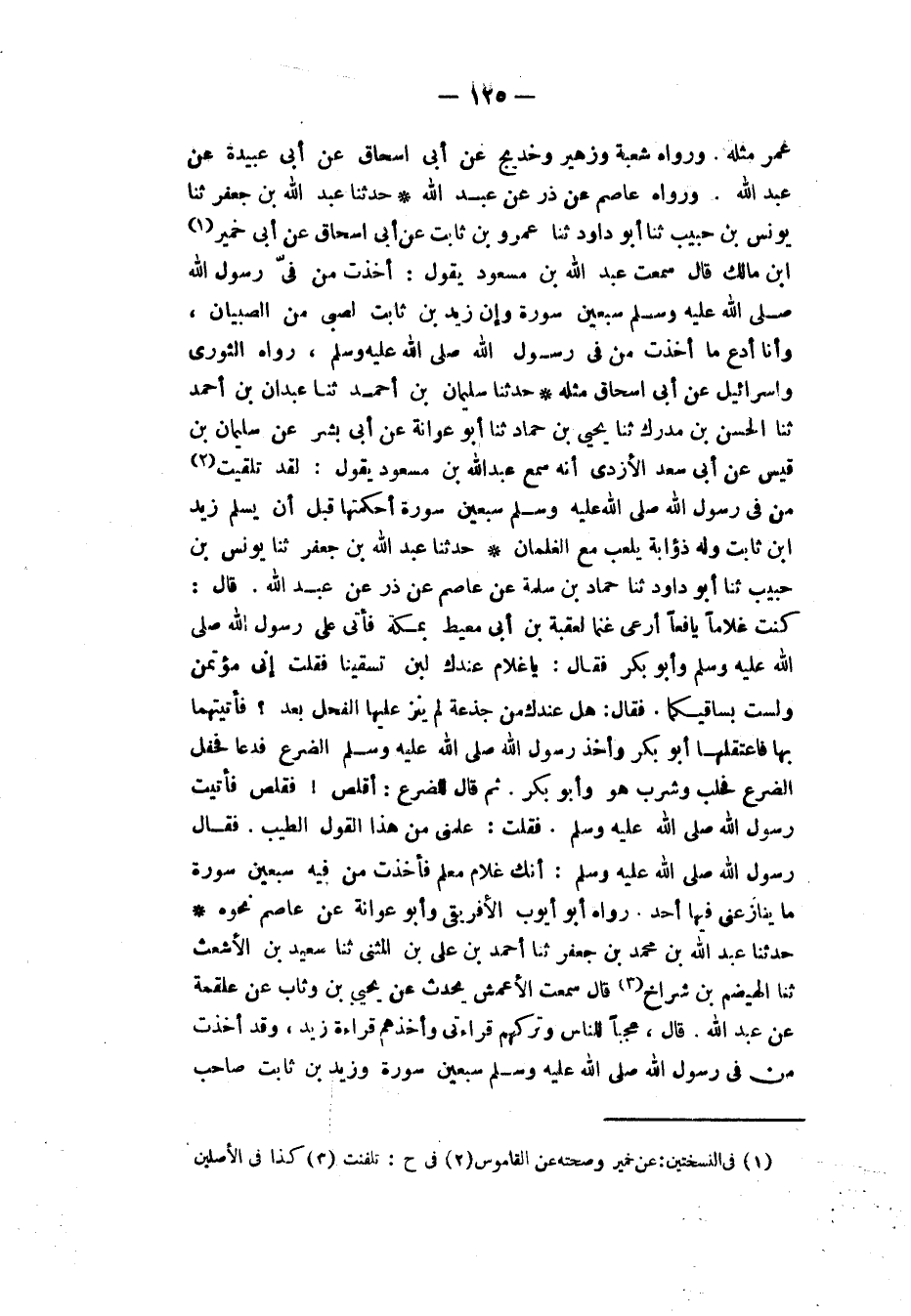 حَدَّثَنَا عَبْدُ اللهِ بْنُ مُحَمَّدِ بْنِ جَعْفَرٍ، ثَنَا أَحْمَدُ بْنُ عَلِيِّ بْنِ الْمُثَنَّى، ثَنَا سَعِيدُ بْنُ الْأَشْعَثِ، ثَنَا الْهَضِيمُ بْنُ شَرَّاخٍ، قَالَ: سَمِعْتُ الْأَعْمَشَ، يُحَدِّثُ، عَنْ يَحْيَى بْنِ وَثَّابٍ، عَنْ عَلْقَمَةَ، عَنْ عَبْدِ اللهِ، قَالَ: «عَجَبًا لِلنَّاسِ وَتَرْكِهِمْ قِرَاءَتِي، وَأَخْذِهِمْ قِرَاءَةَ زَيْدَ، وَقَدْ §أَخَذْتُ مِنْ فِي رَسُولِ اللهِ صَلَّى اللهُ عَلَيْهِ وَسَلَّمَ سَبْعِينَ سُورَةً، وَزَيْدُ بْنُ ثَابِتٍ صَاحِبُ -[126]- ذُؤَابَةٍ غُلَامٌ يَجِيءُ وَيَذْهَبُ بِالْمَدِينَةِ»